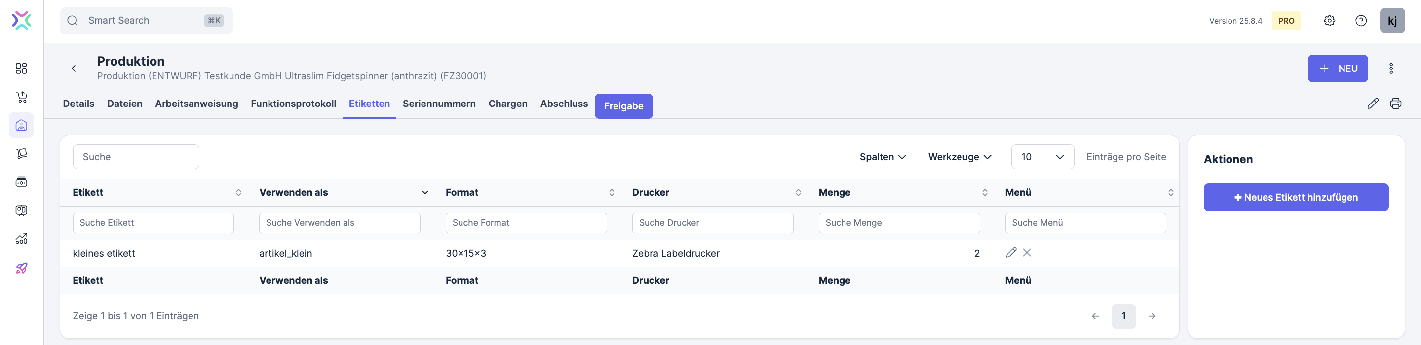 Sofern du im Artikel des Erzeugnisses Etiketten ausgewählt hast, werden sie hier angezeigt. Du kannst auch neue Etiketten hinzufügen:
