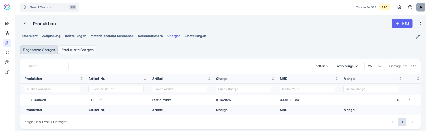 Hier erhälst du einen Überblick über die in der Produktion eingesetzten und produzierten Chargen bzw. Mindesthaltbarkeitsdaten.
