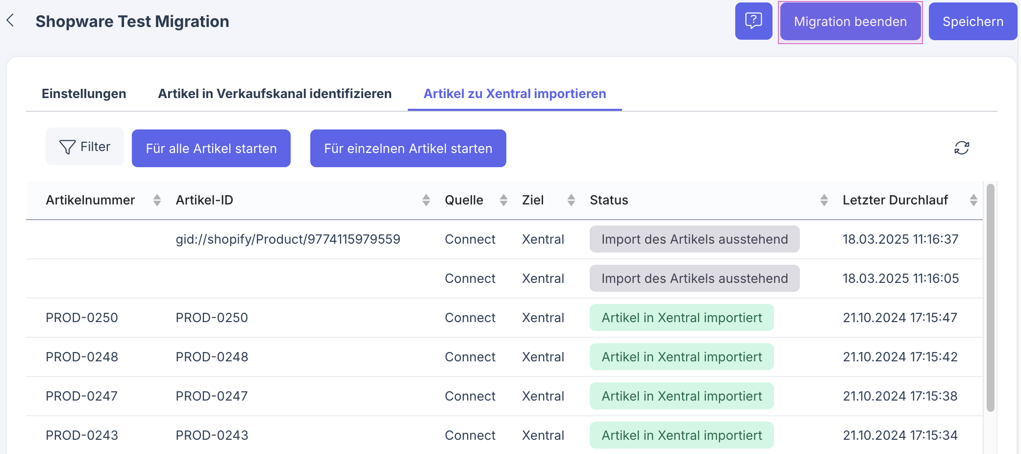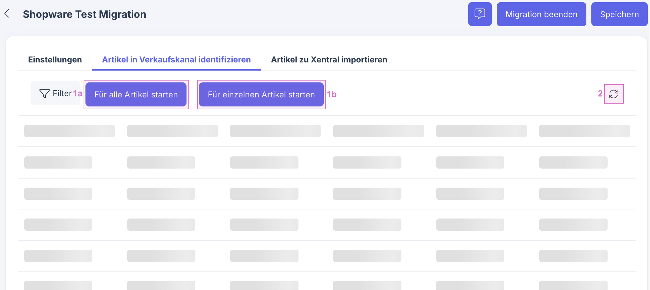Um Artikel zu importieren, klicke auf (1a) Für Alle Artikel starten bzw. auf (1b) Für einzelnen Artikel starten und gib ggf. eine Shopware6-Artikelnummer ein. Aktualisiere die Anzeige mit Neu Laden (2). Sobald der Import startet, wird die Schaltfläche Migration beenden bis zum Abschluss der Migration ausgegraut.