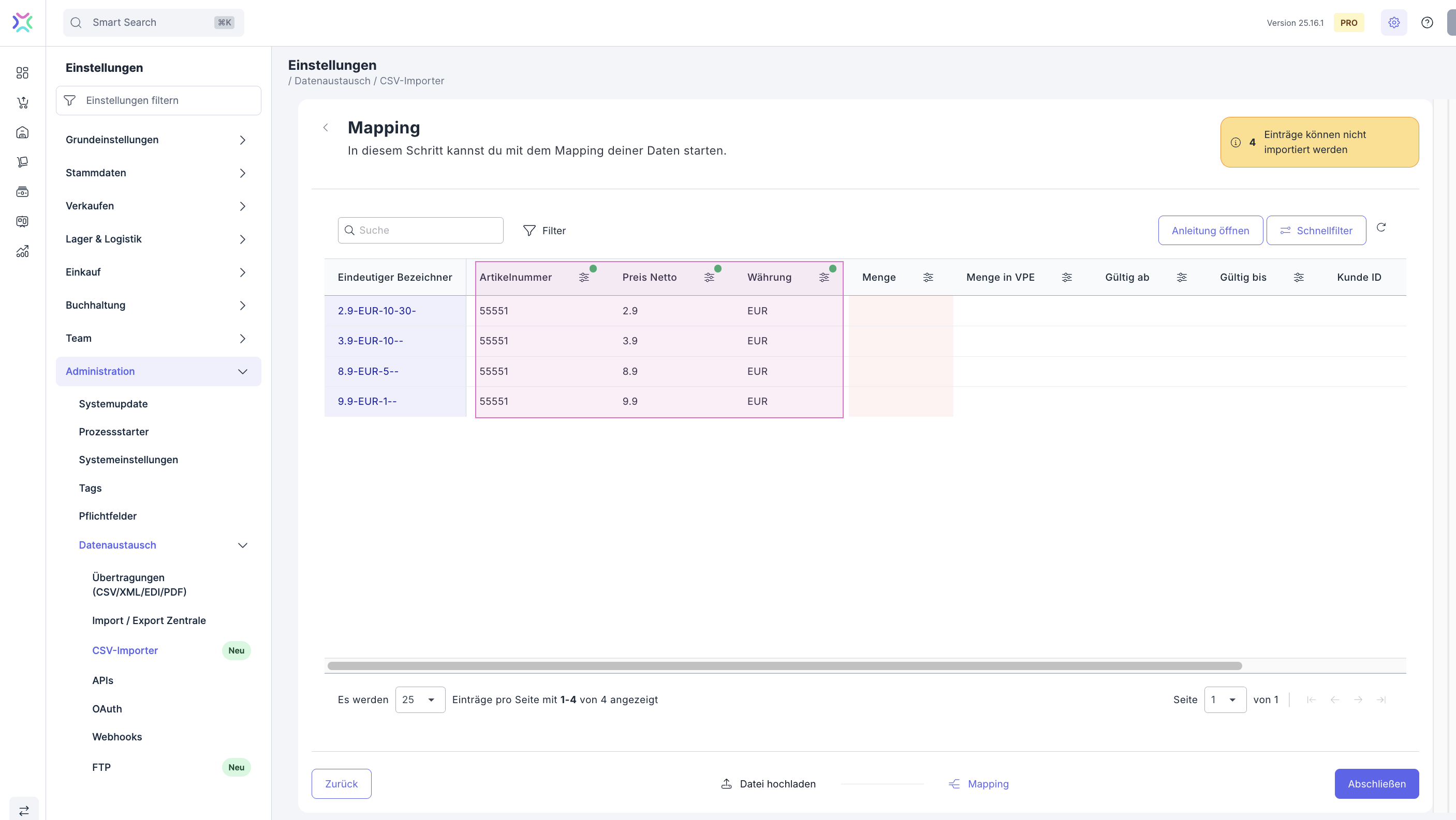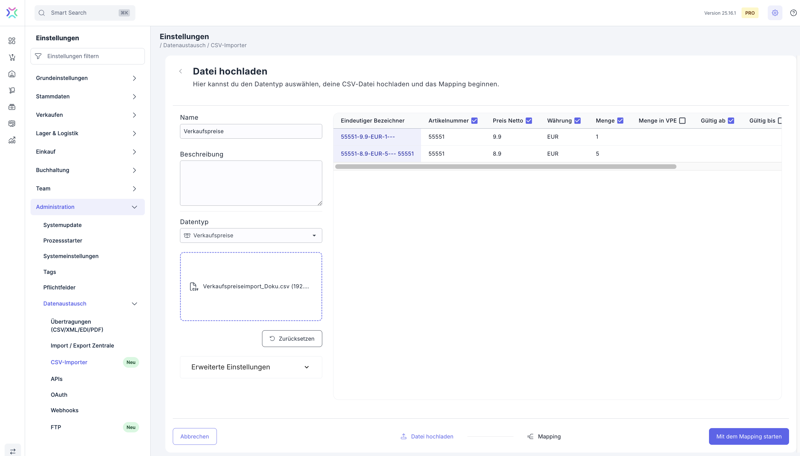 Sobald du auf Mit dem Mapping starten geklickt hast, werden die Daten in eine Vorschau geladen.