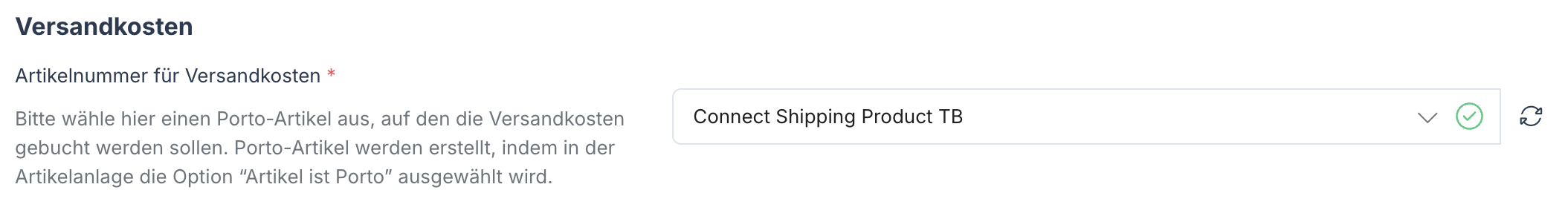 Ordne unter Artikelnummer für Versandkosten den Porto-Artikel zu, auf den Versandgebühren geschrieben werden sollen.