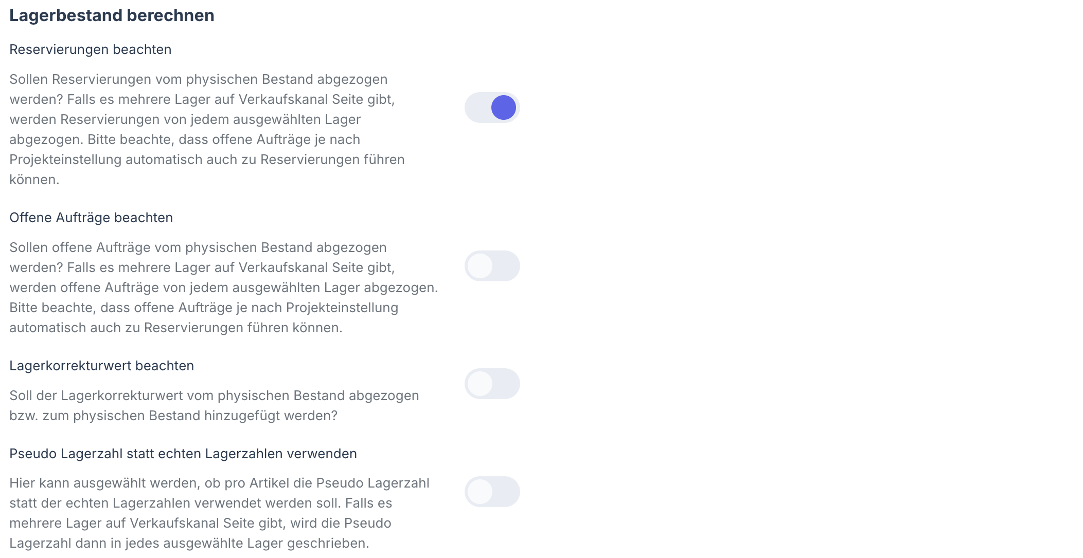 “Reservierungen beachten”: Setze den Schalter nach rechts, wenn die reservierte Menge vom Lagerbestand abgezogen werden soll.