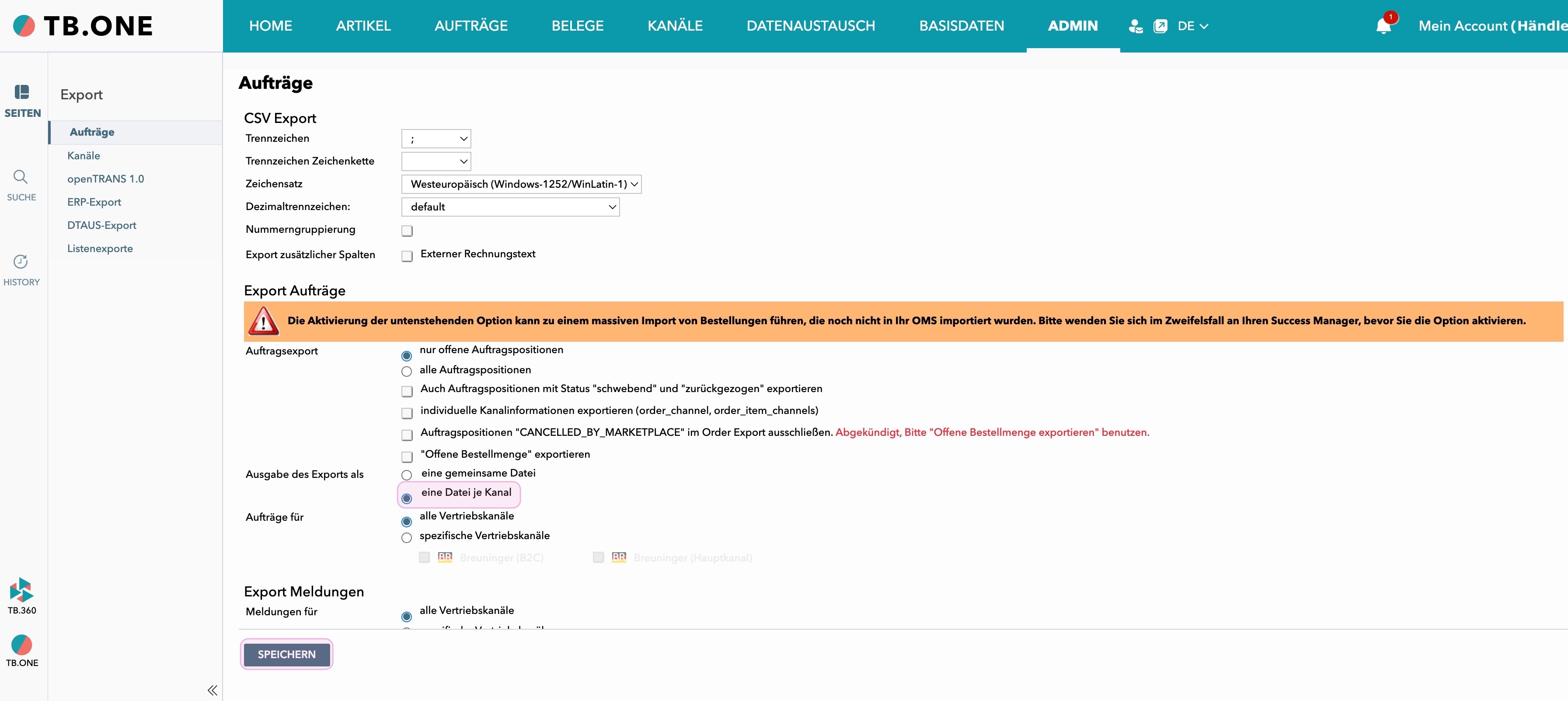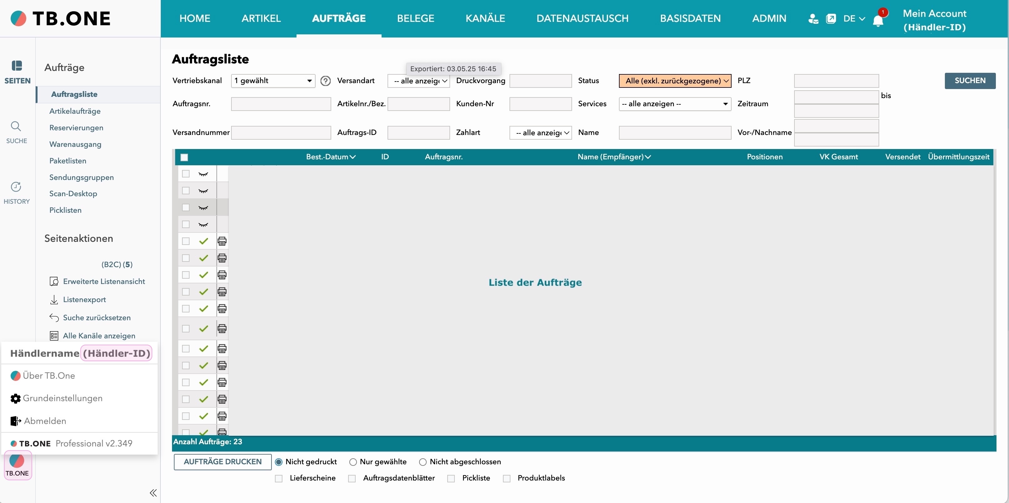 Rufe schließlich Admin > Export > Aufträge auf.