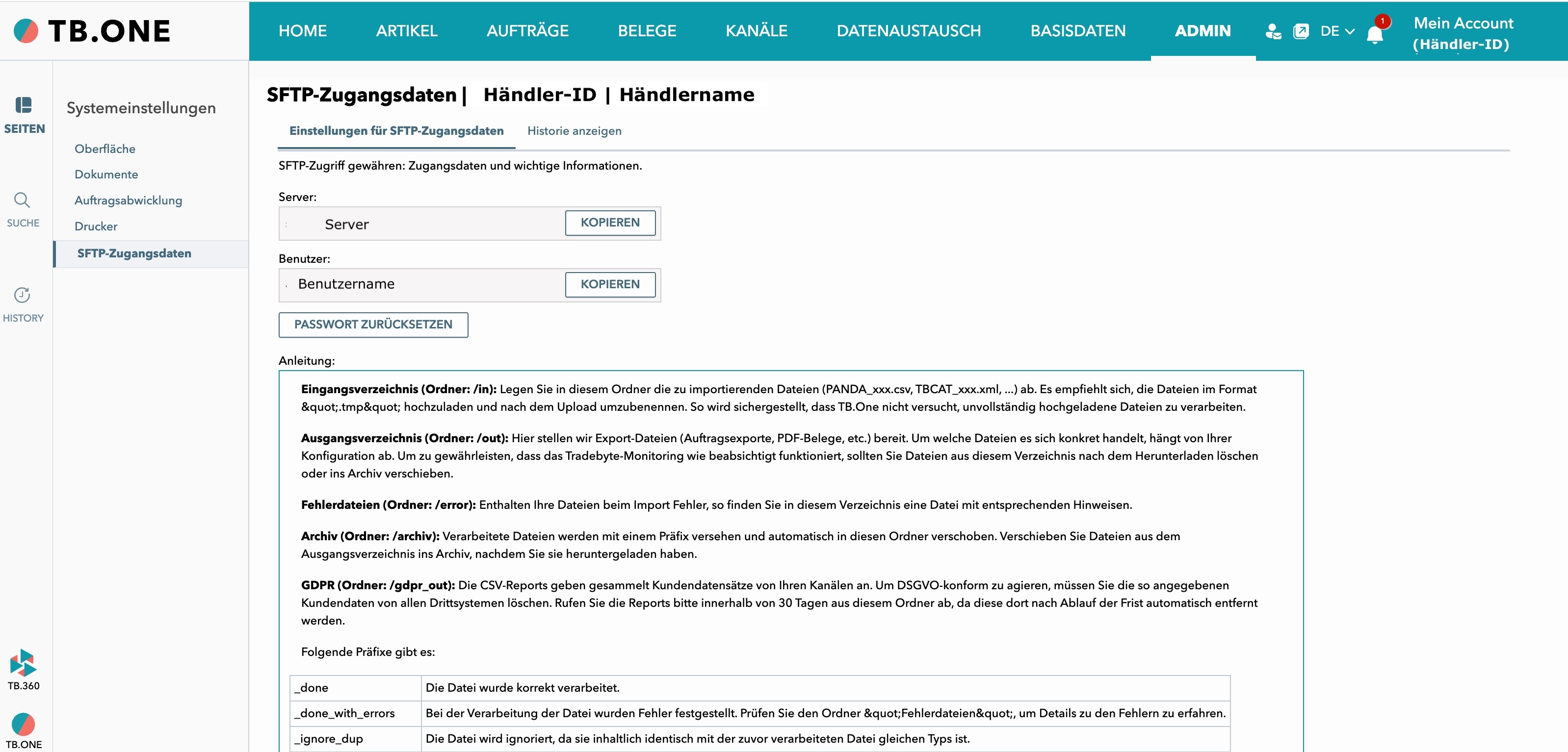 Navigiere zu Admin > Systemeinstellungen > SFTP-Zugangsdaten.