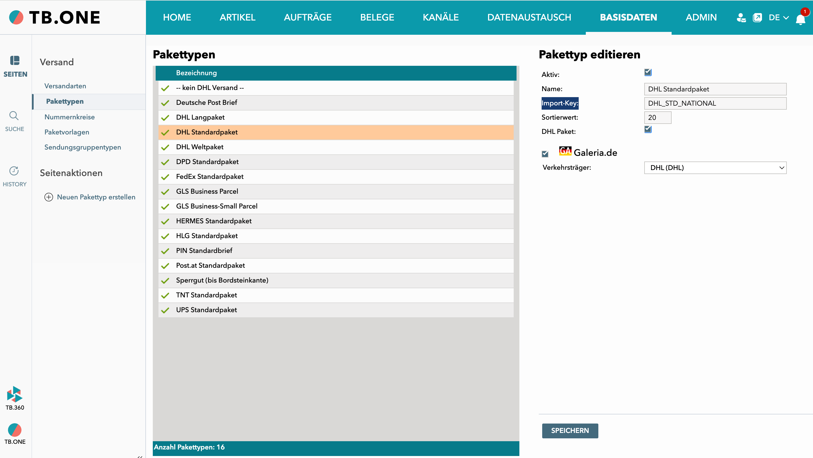 Unter Basisdaten > Versand > Pakettypen kannst du deine Pakettypen verwalten. In TB.One hat jeder Pakettyp einen Import-Key. Notiere die Import-Keys aller Pakettypen, die du mit Xentral verknüpfen möchtest und trage sie später bei der Workflow-Konfiguration ein.