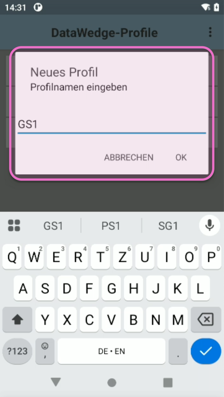 Gib einen aussagekräftigen Namen für das Profil ein, z.B. "Barcode GS1". Tippe dann auf OK.