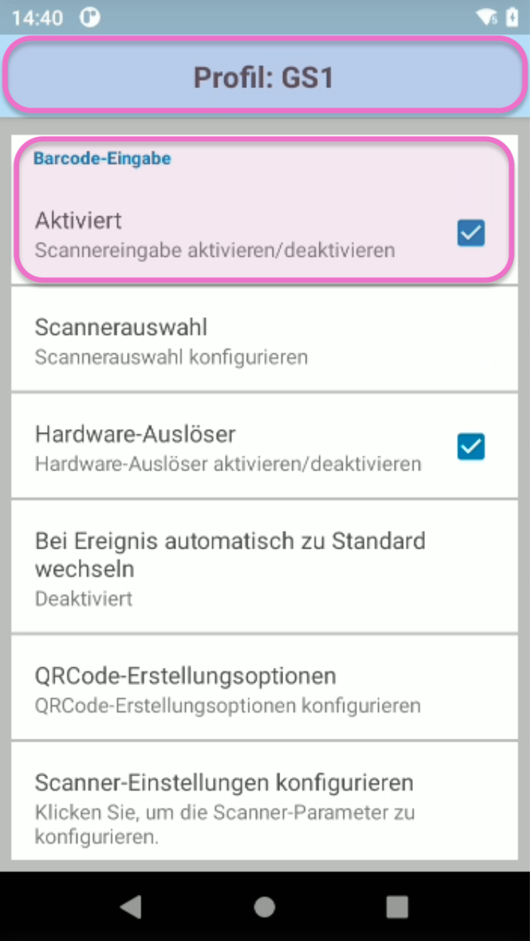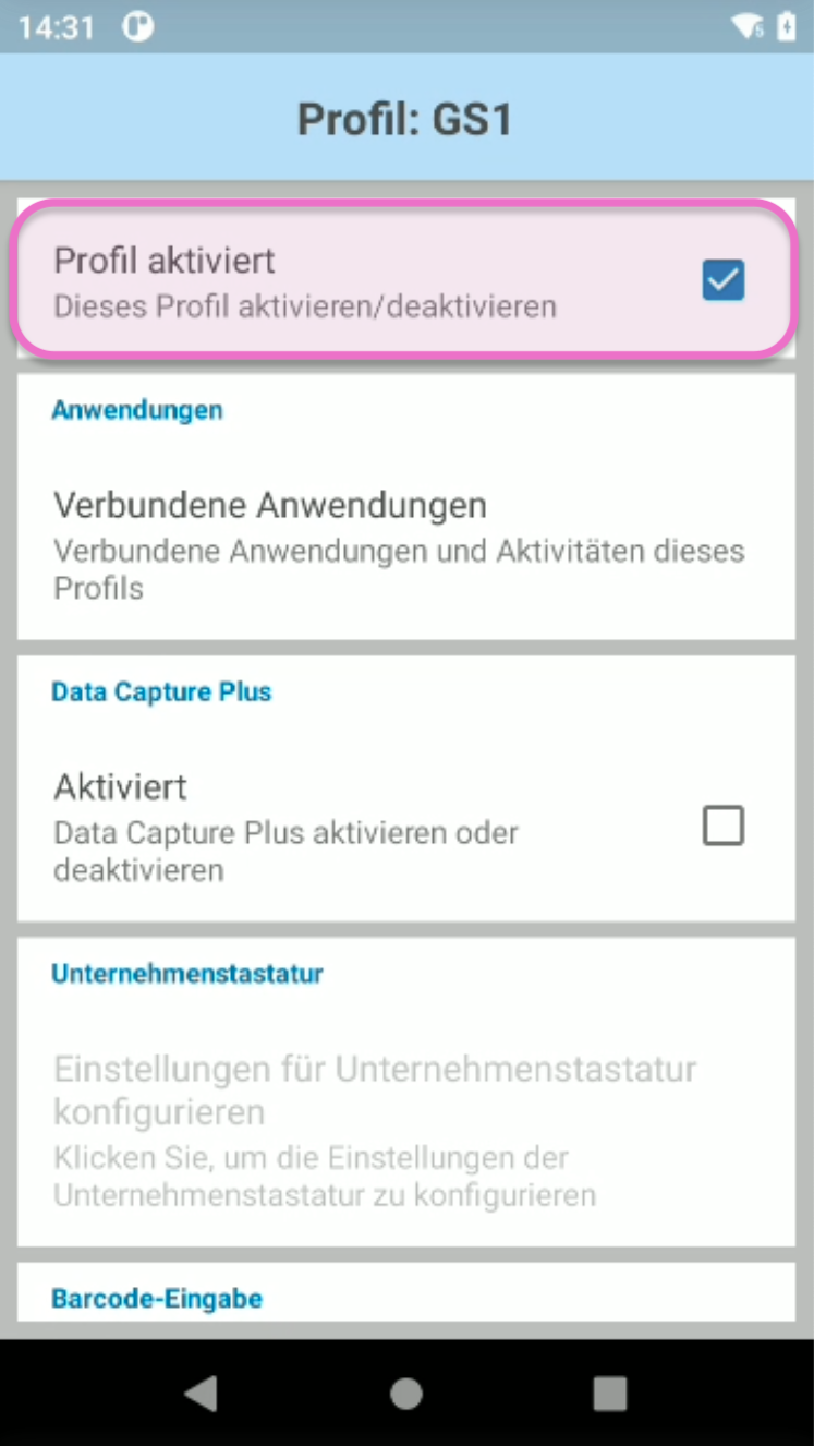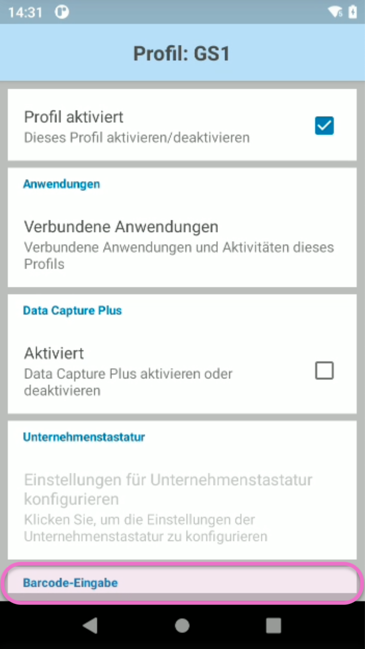 Auf den oben genannten und den meisten gängigen MDEs des Herstellers Zebra musst du die App DataWedge direkt auf dem Gerät nutzen, um darin ein neues Profil für die Erkennung von GS1-Barcodes zu erstellen. Ohne dieses Profil kann das Gerät die im Barcode verschlüsselten Daten nicht korrekt entschlüsseln.