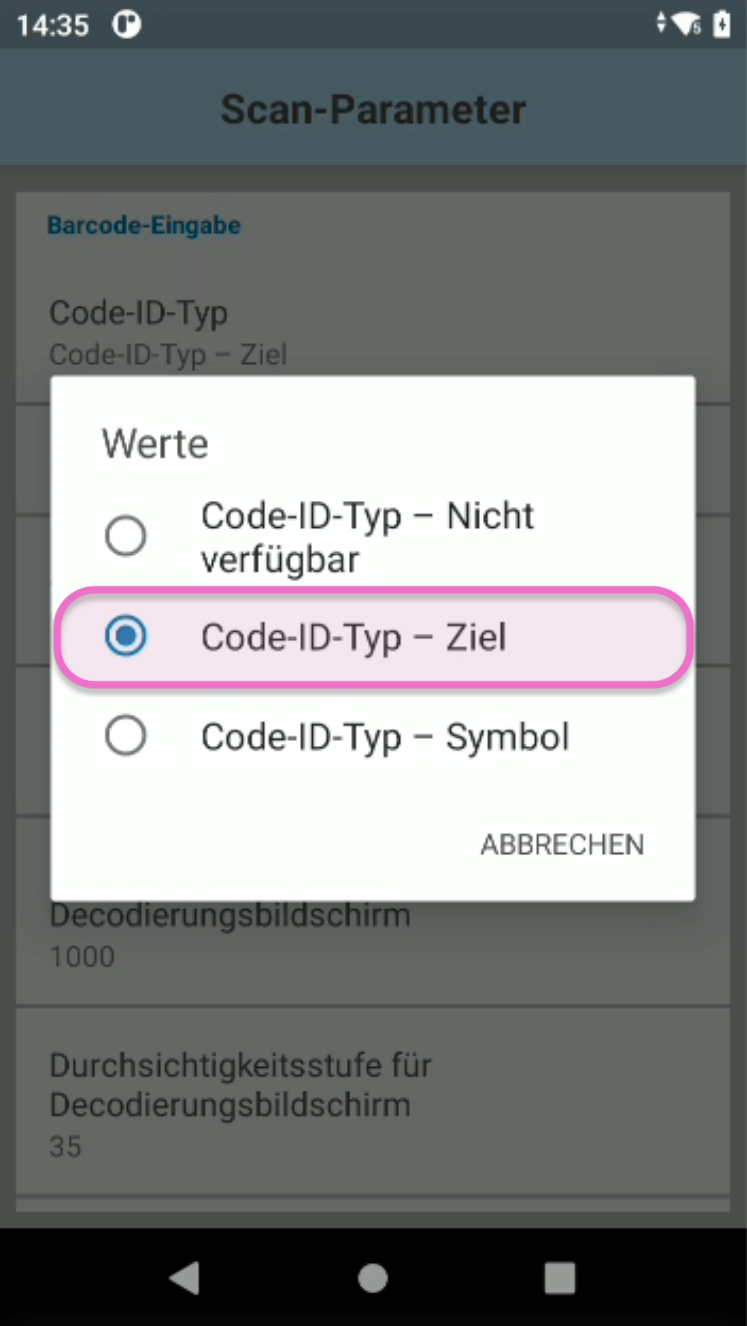Wähle die Option Code-ID-Typ - Ziel.