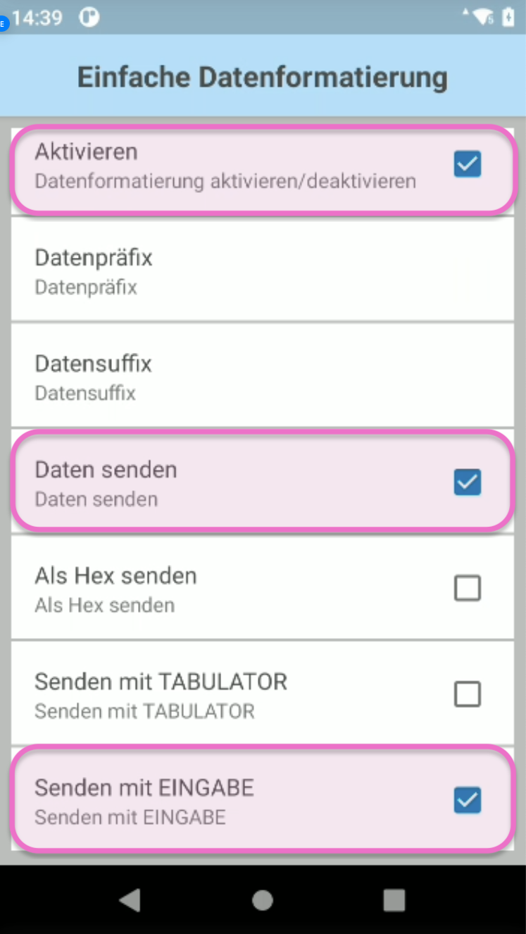 Gehe zum Bereich Einfache Datenformatierung und aktiviere die Optionen Aktivieren, Daten senden und Senden mit EINGABE.