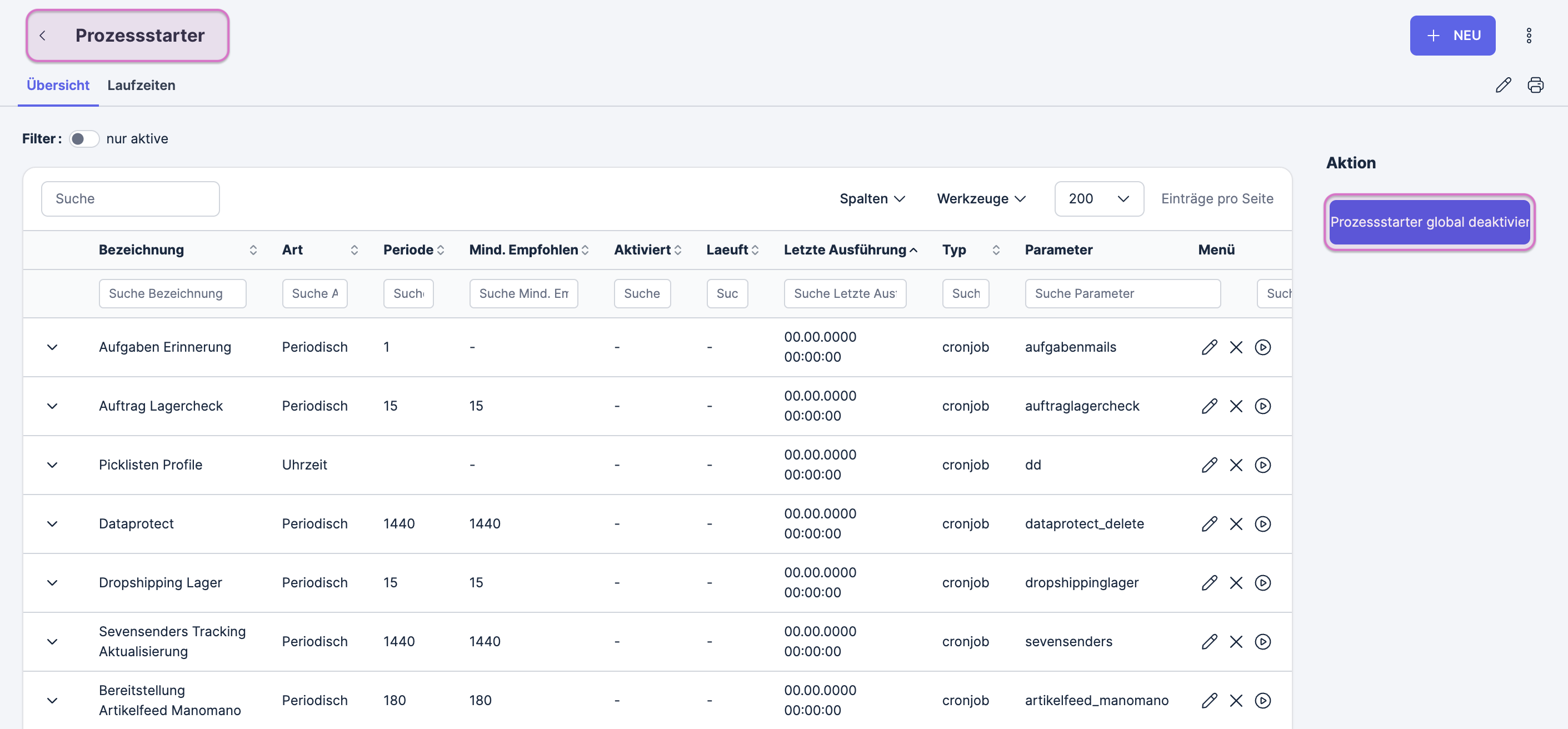 Globally disabling the process starters in Xentral is essential so that no sales orders are handed over to the dispatch center during inventory or any other actions that affect inventories continue to run automatically while inventories are being counted, so take this step with extra care to avoid erroneous inventory counts and tedious rework. Do not reactivate the process starters until the stocktaking process is completed.