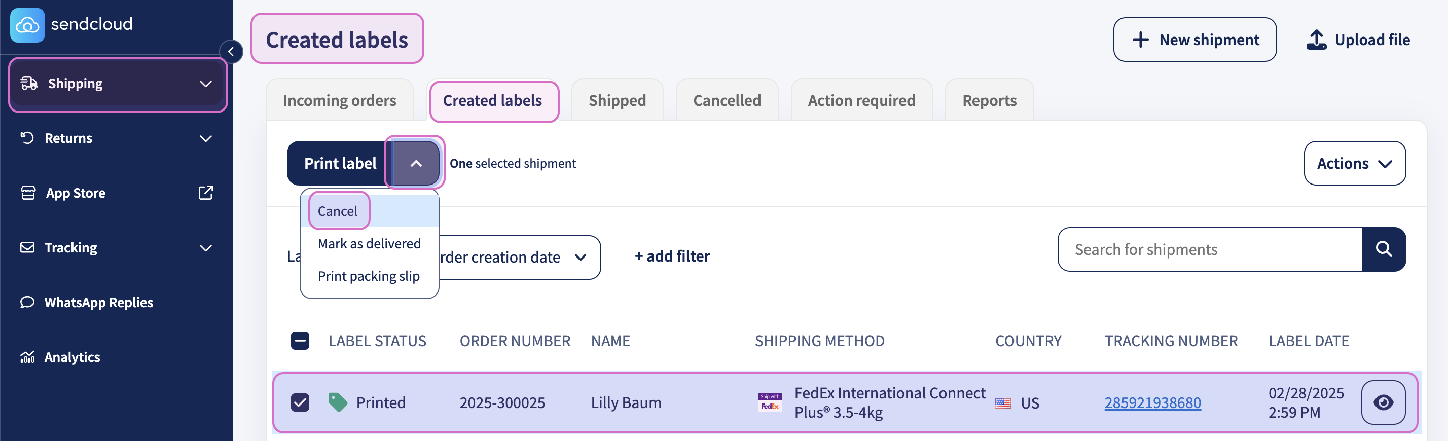 After your test print is complete, you can cancel the shipping label in your Sendcloud account. To do so, proceed as follows.
