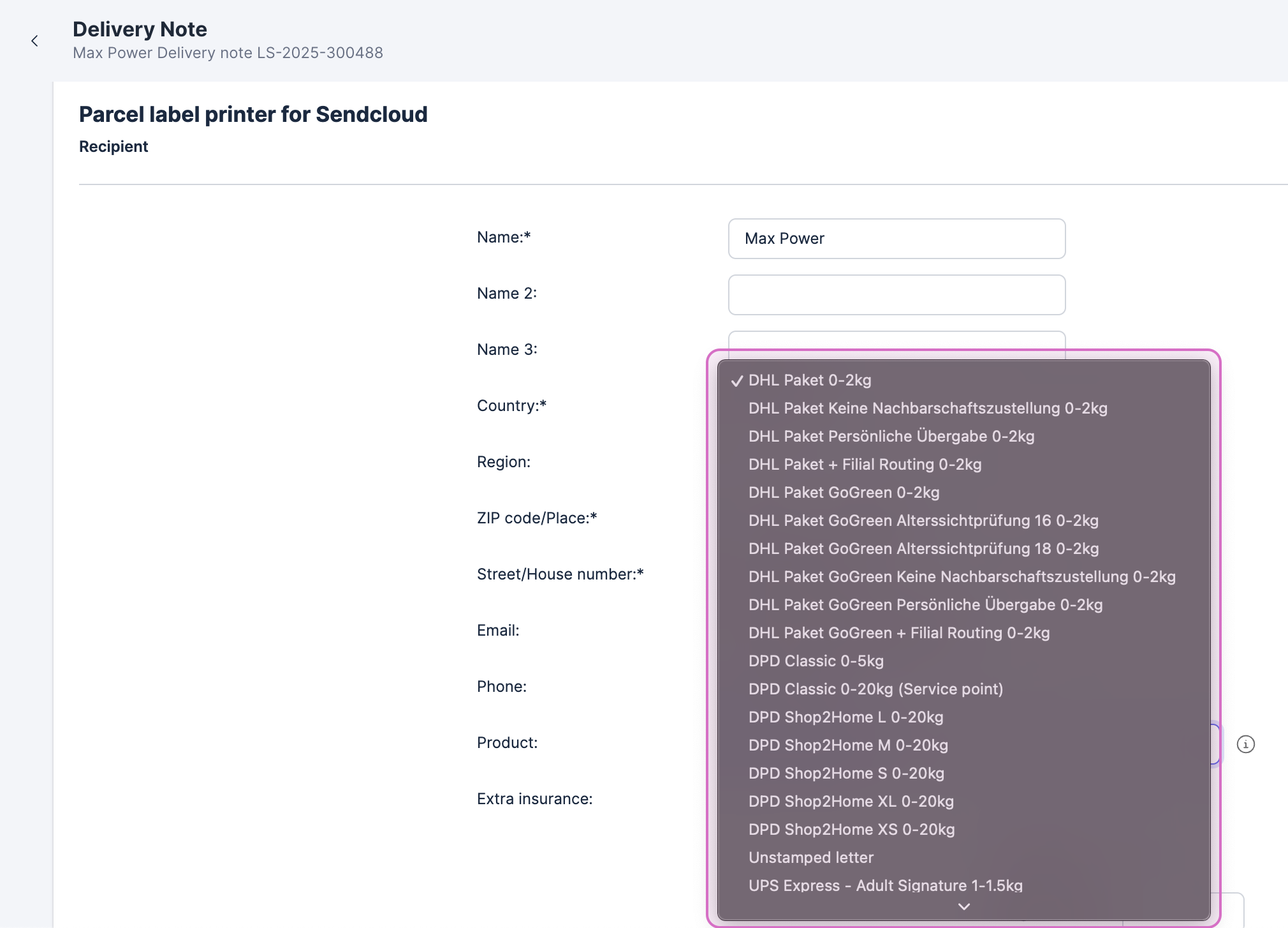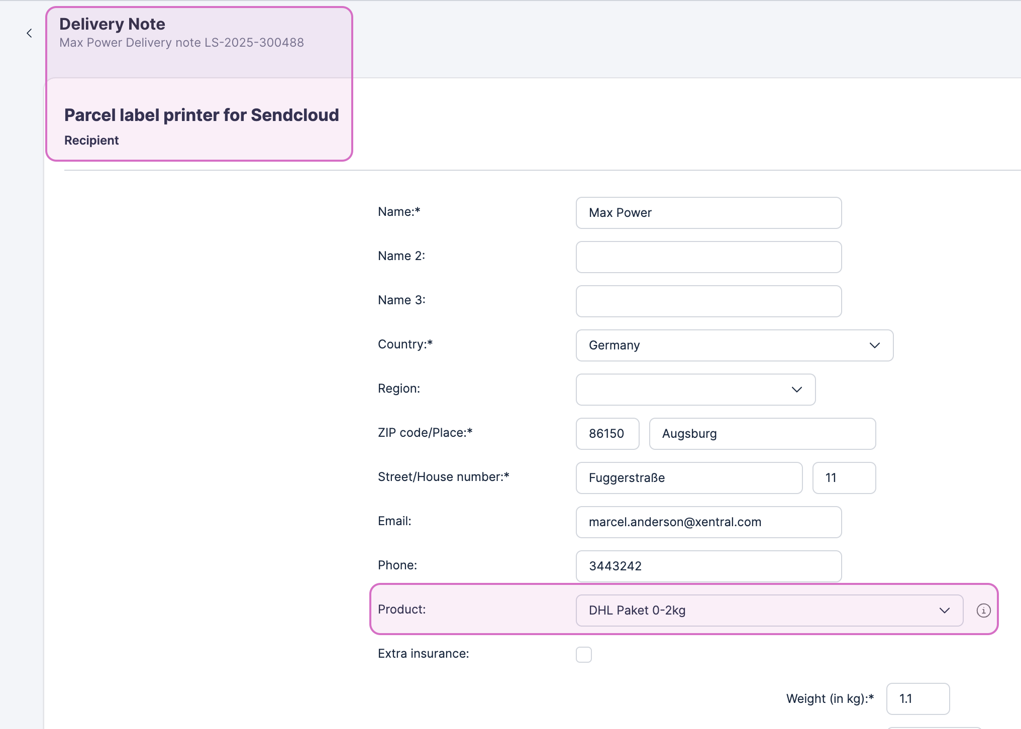 Only products that you have booked via a contract with the respective shipping service provider or that you have access too via a Sendcloud plan are available for selection here. In addition, the product selection is limited based on the weight of the shipment. In case you have not activated the option Selection in parcel label dialog, but have created individual Sendcloud shipping methods for each shipping service provider in Xentral (e.g. “Sendcloud DHL” or “Sendcloud DPD”), you select the specific shipping product in step 4 (see above). Afterwards, the respective Product is preselected in the Shipping label tab of the delivery note.