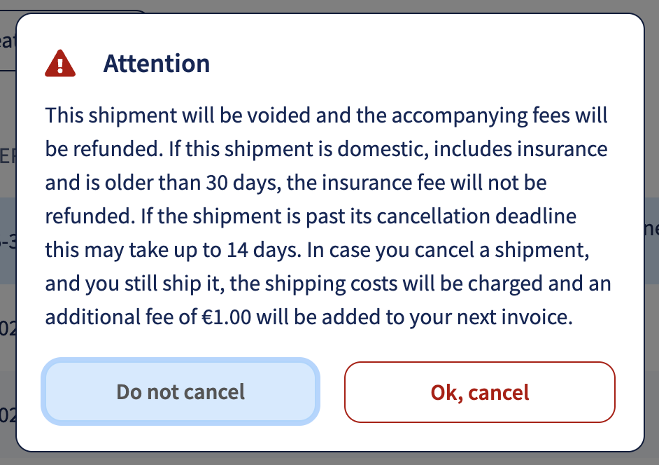 A note informing you on the conditions for refunding shipping label costs and the cancellation periods Click on Ok, cancel to confirm the cancellation.