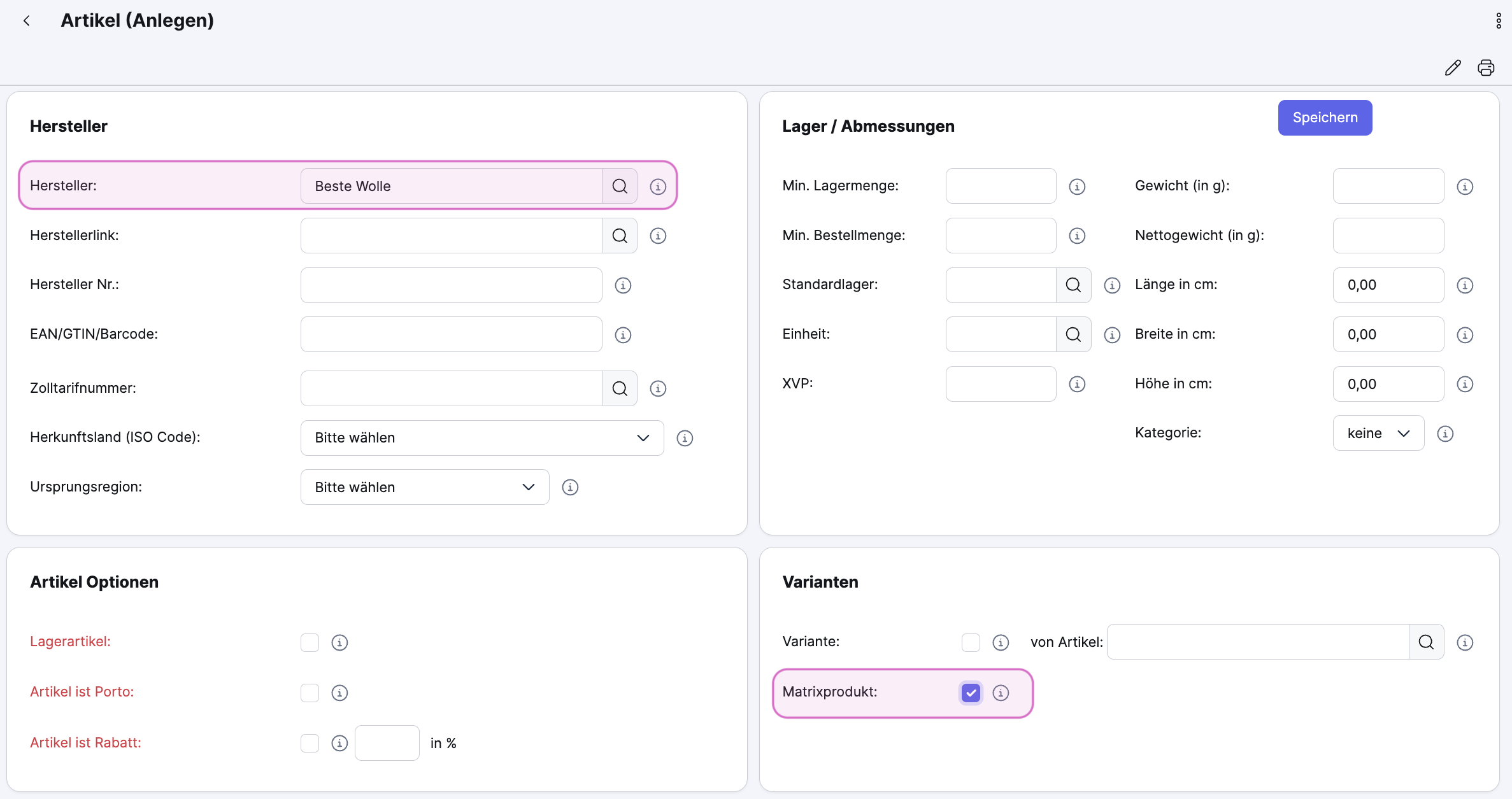 Scrolle weiter nach unten, gibt einen Hersteller (für Shopify erforderlich) ein und hake Matrixprodukt an. Bestätige die Artikelanlage mit Speichern.