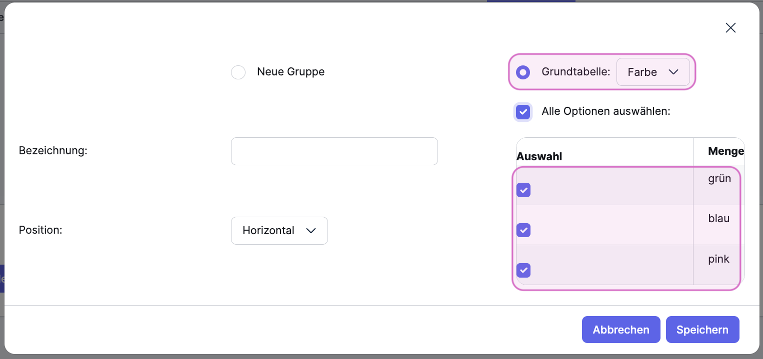 Wähle die zuvor angelegte Grundtabelle aus und hake die Optionen an, die für dieses Matrixprodukt zutreffen.