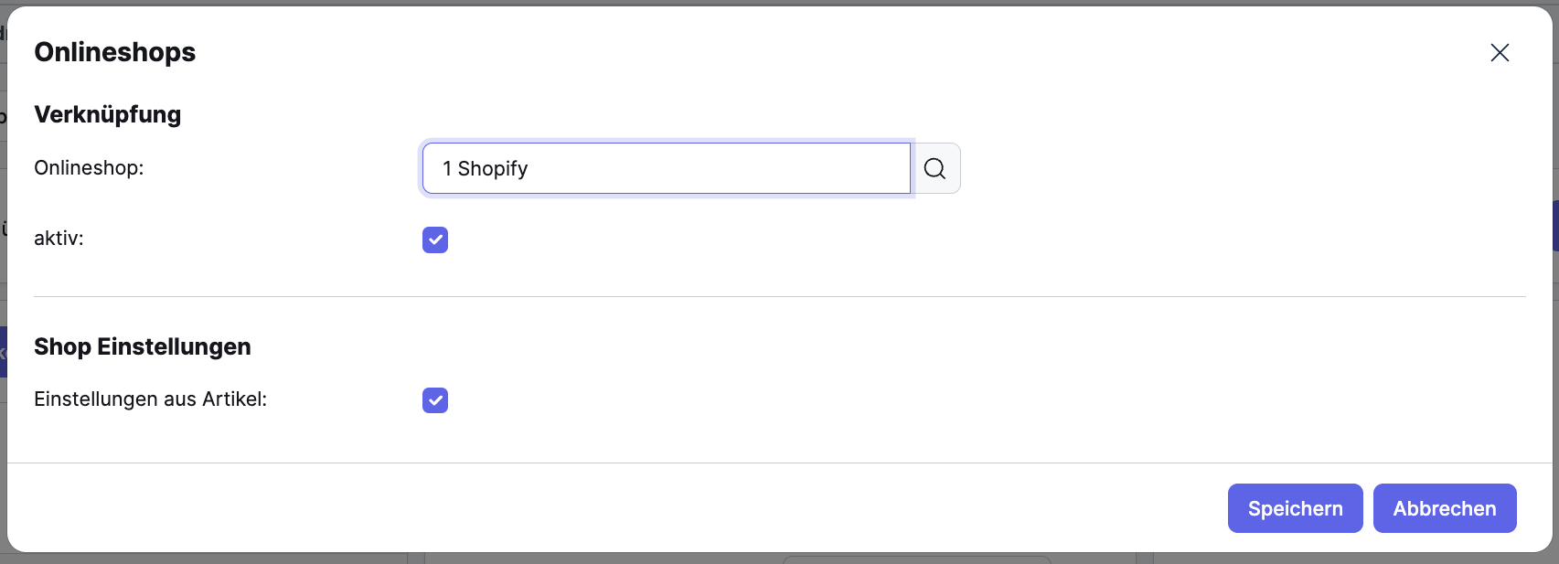 der Integrationsmodus für Artikel aktiv ist (Einstellungen > Verkaufen > Shops/Marktplätze > Shopify > Workflows > Artikel)