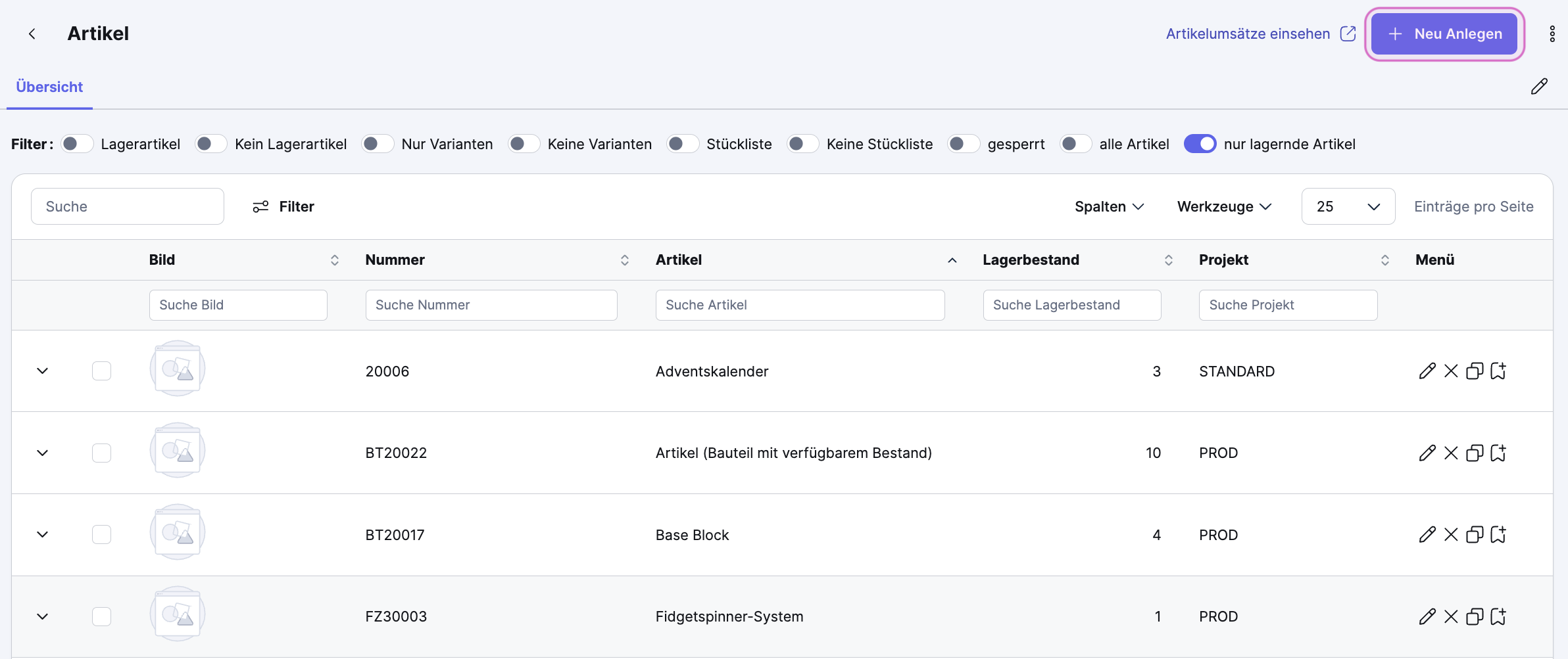 Navigiere zum Artikelstamm (Verkaufen > Artikel) und klicke auf + Neu Anlegen, um einen neuen Artikel zu generieren.