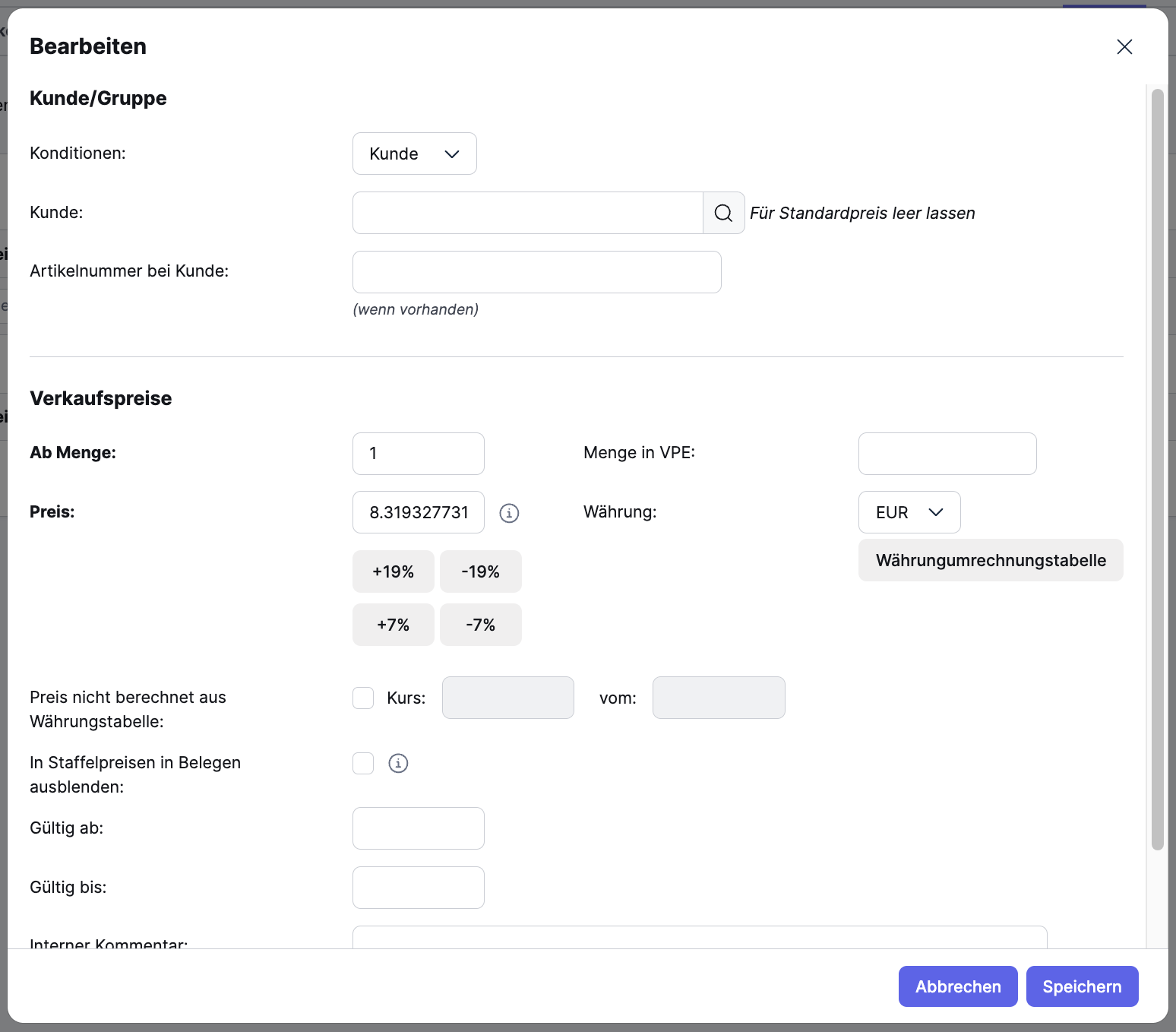 Öffne den Reiter Verkaufspreis und klicke auf +Neuer Verkaufspreis, um einen Verkaufspreis anzulegen.