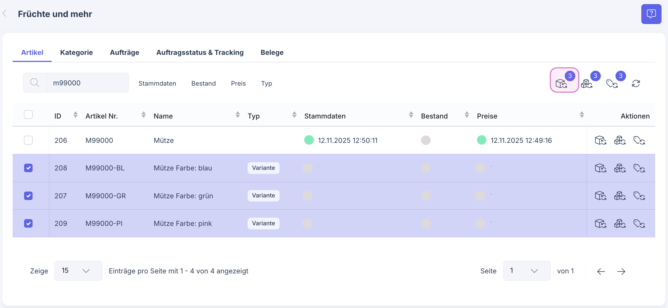Um die Varianten zu erzeugen, aktiviere alle Artikel auswählen und klicke auf Fehlende Artikel erzeugen.