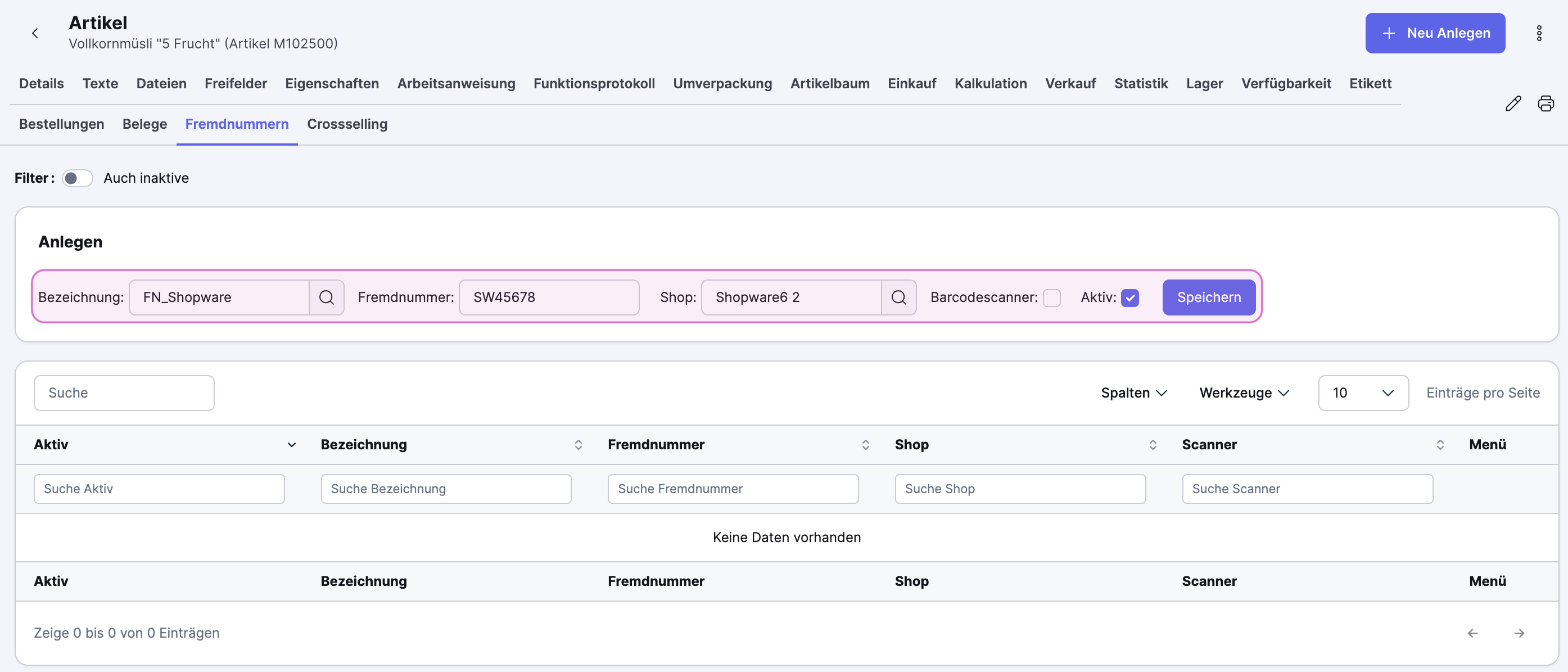 Um Fremdnummern einzutragen, öffne den Artikel im Xentral Artikelstamm und wechsele zum Reiter Fremdnummern:
