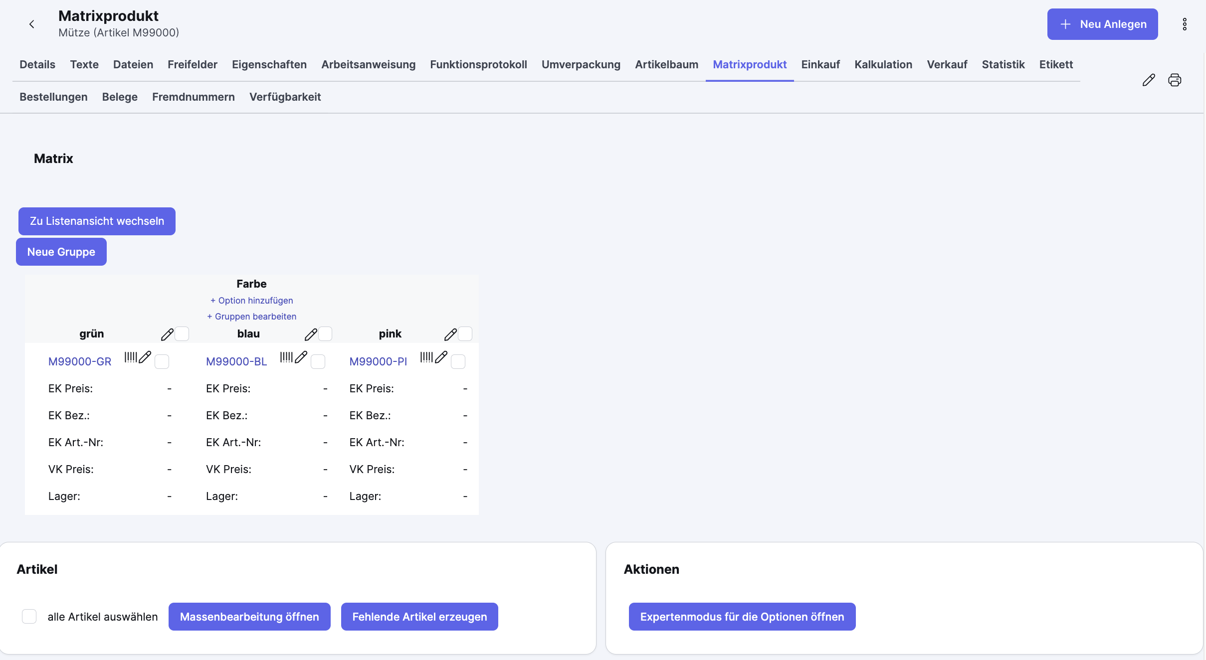 das Matrixprodukt und alle Varianten in Xentral wie oben konfiguriert sind,