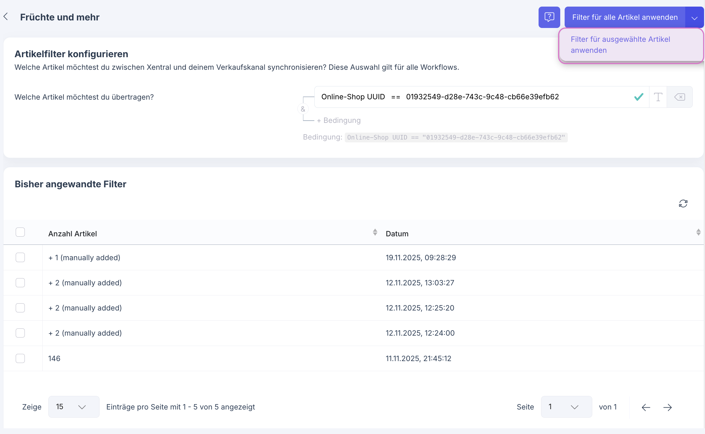 Erweitere deine Artikelliste. Dies tust du, indem du entweder erneut Filter für ausgewählte Artikel anwenden wählst und nun die Artikelnummern der Varianten einträgst oder indem du Filter für alle Artikel anwenden nutzt.