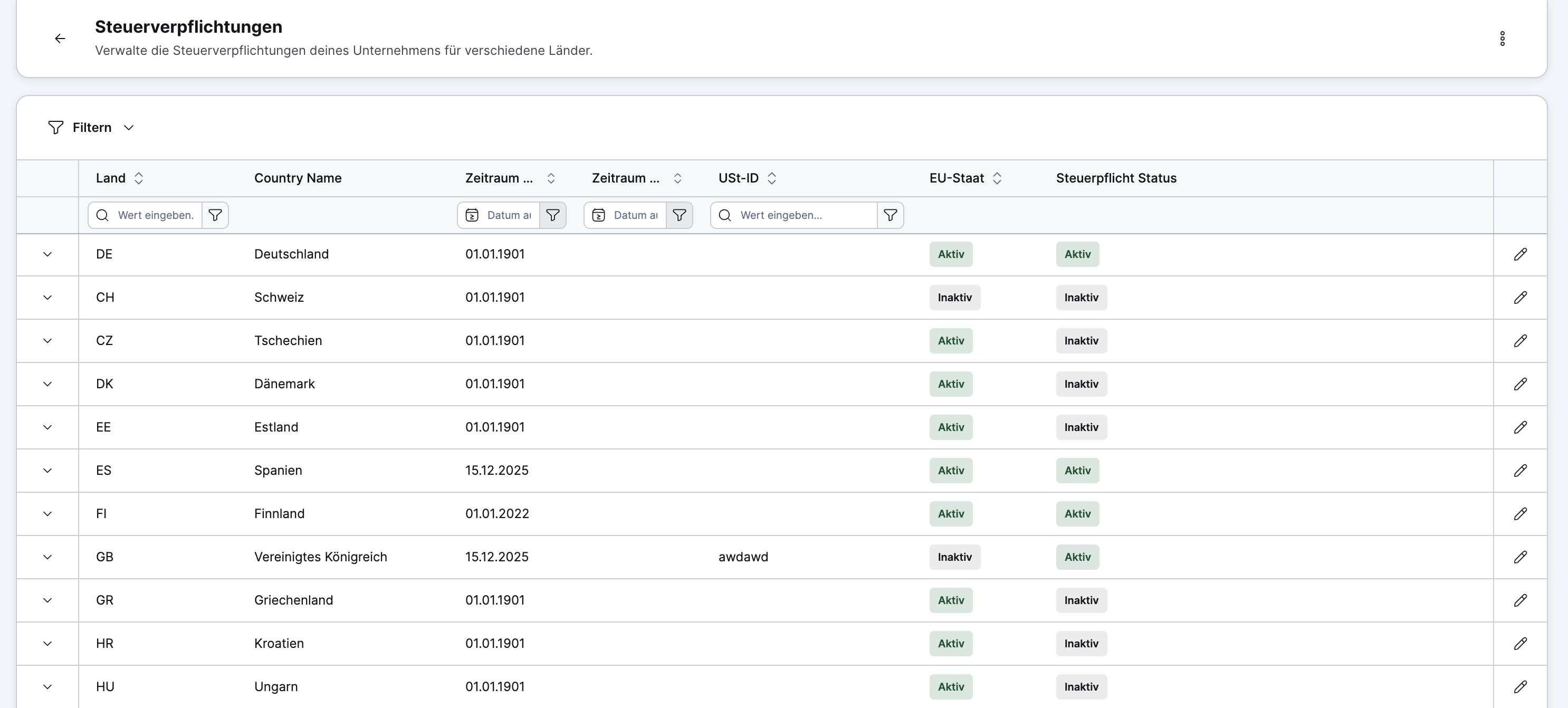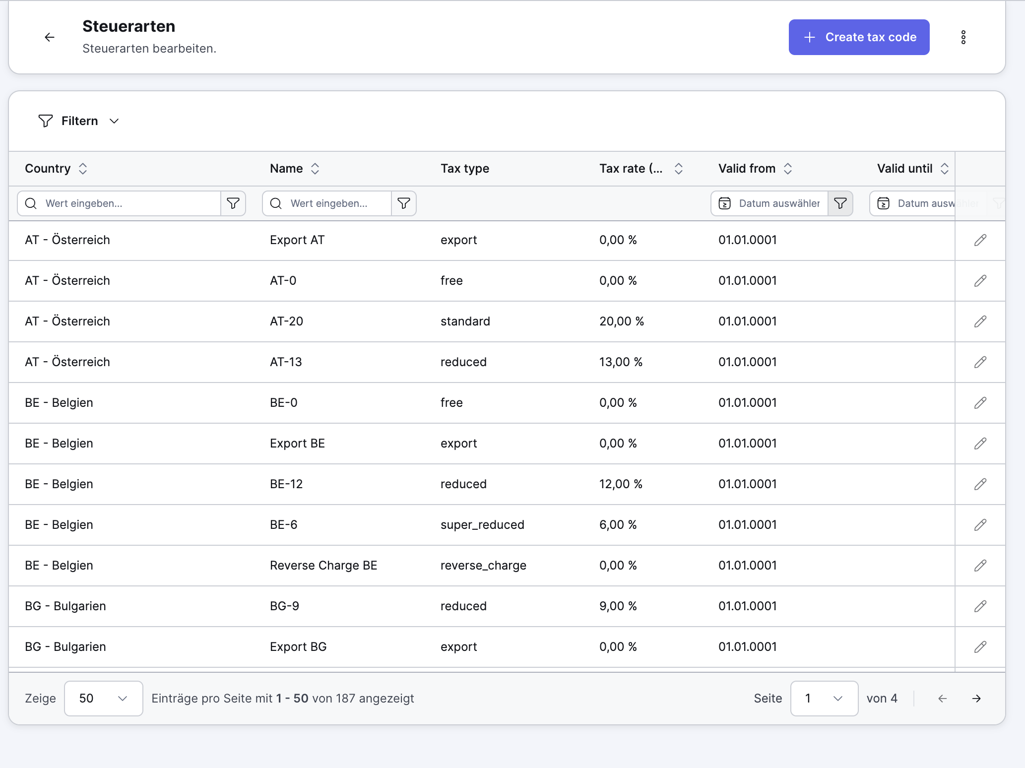 Tax rates are no longer managed individually in the Xentral General Ledger. Instead, there is a complete overview of all VAT codes used across Europe.