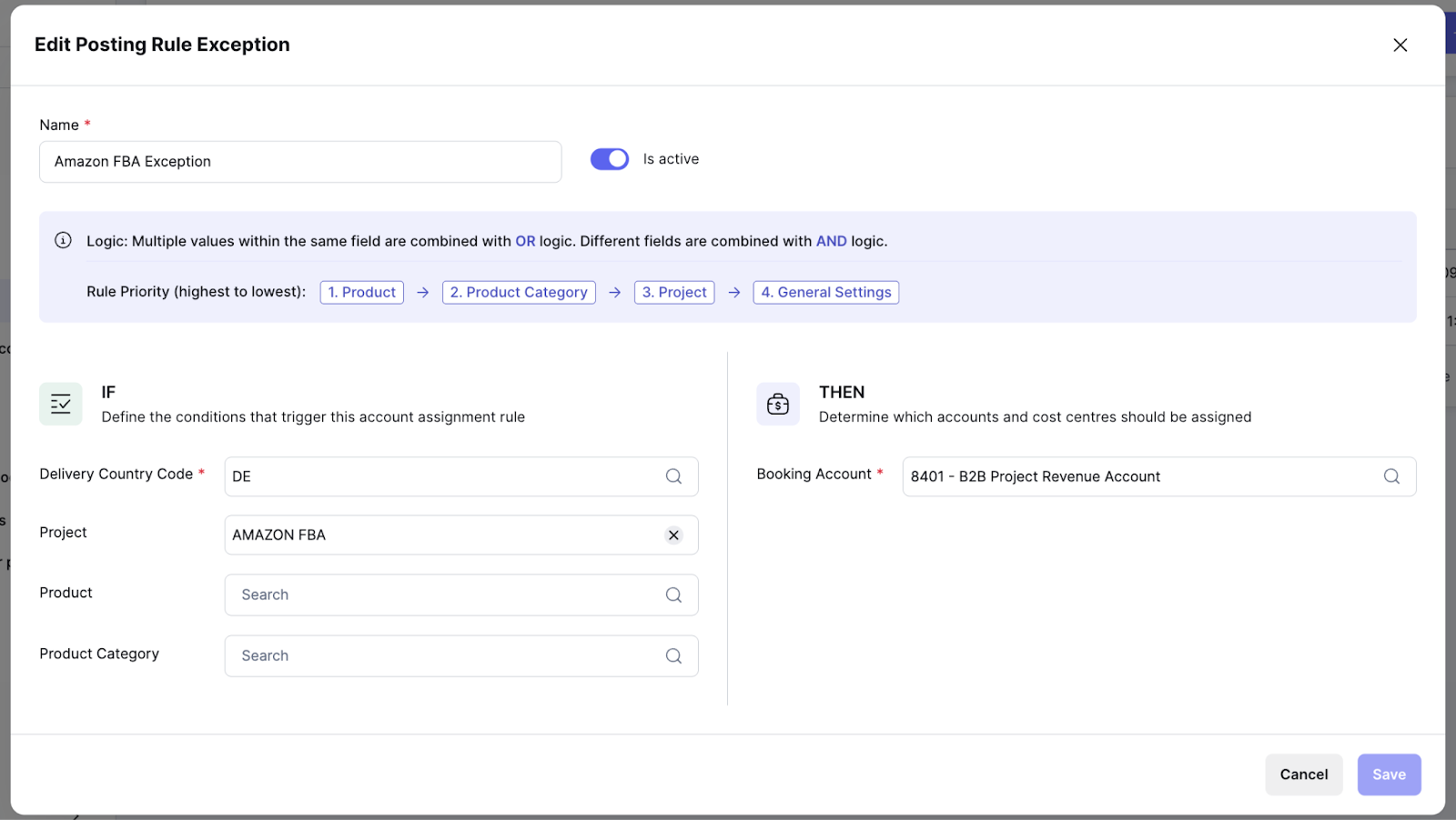 Result: All revenues generated in the “Amazon FBA” project and delivered to Germany are automatically posted to revenue account 8401 instead of the standard account from the tax settings.