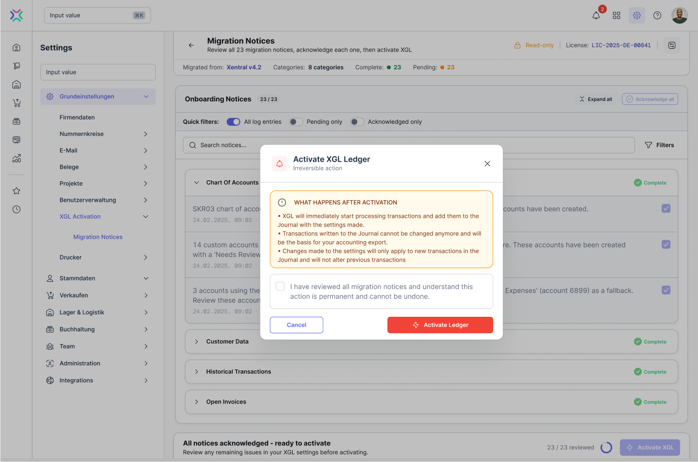 By clicking “Activate Xentral General Ledger”, you start the journal. From that point on, all transactions are recorded in the journal.