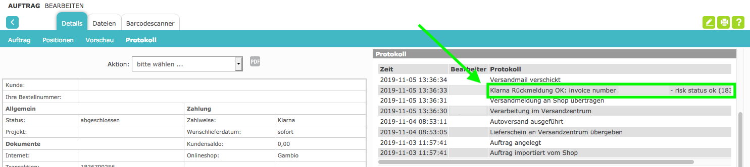 As soon as the tracking number has been recorded, a request is sent to Klarna. If this has been successfully reported back, you will receive a log entry in the order from the Klarna feedback, which you can view via the minidetail.