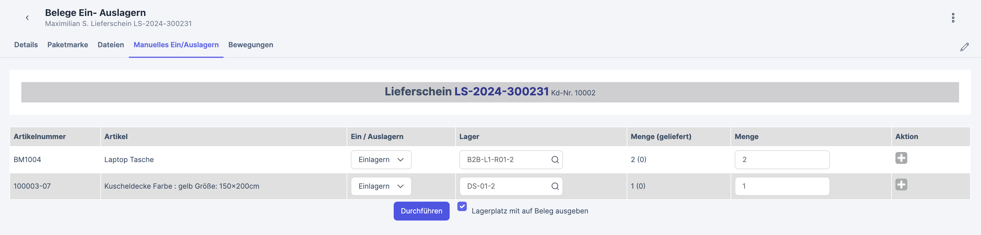 Click on the tab: Manual storage/ retrieval. The function in the delivery note is set to storage (dropdown) per position.
