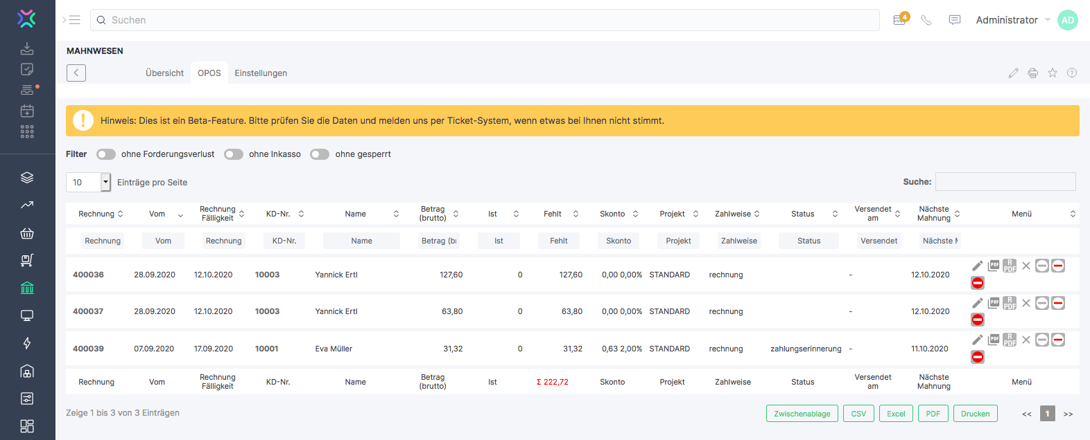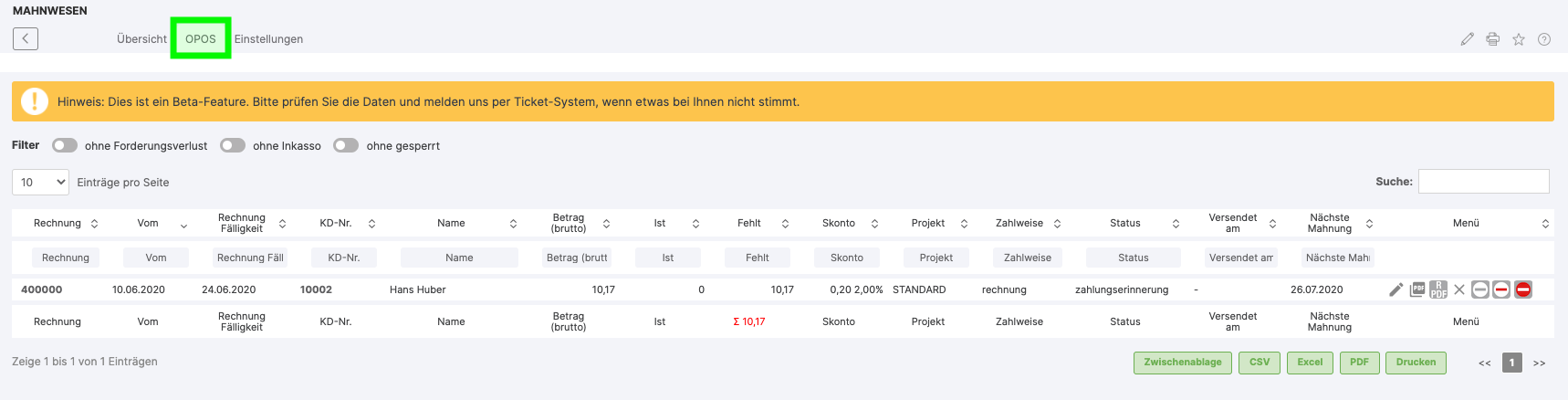 If an invoice is still due after the payment reminder period, the next time the reminder is started, the first reminder is sent (reminder 1). If the invoice remains open after the next deadline, the second reminder is sent, and so on. In addition, invoices can be called up directly via the action menu on the right or the document can be displayed as a PDF. It is also possible to cancel the invoice, to book differences as a cash discount, to book the invoice as a loss or to block the invoice in the dunning process. An important working basis for accounting is also provided by the OPOS list. It shows all open invoices and their due (partial) amounts. Invoices that are not yet due are displayed without dunning level. Invoices, that are due are displayed with the respective dunning level.