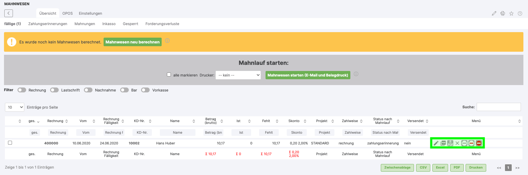 The invoice copy and the actual dunning document (payment reminder or reminder) are sent by e-mail. The dunning process can be influenced or stopped by the user for the individual invoices at any time. This is done via the icons presented below in the list view.