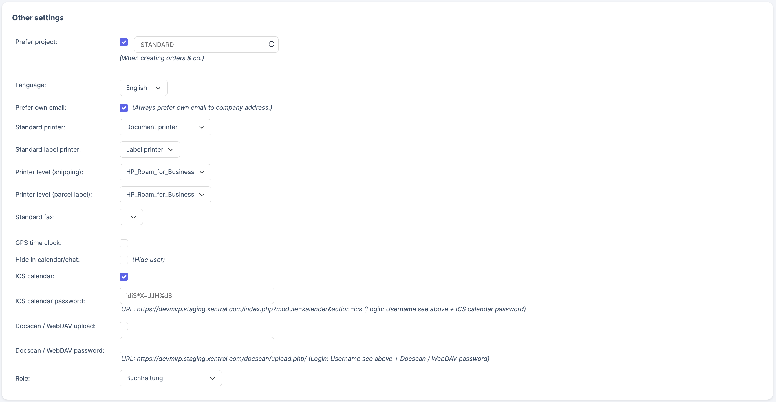 The Other settings tab allows you to refine a variety of user settings. You can carry out custom printer settings that take priority over any other default settings, subscribe to your Xentral calendar on an external device and carry out other settings as well.