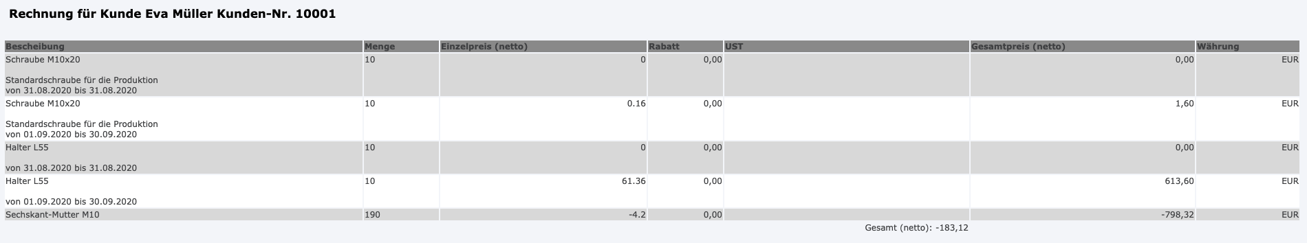 The preview of the positions that will be calculated for the customer is called up via "Details in the last column. This overview shows the periods and the positions that have been entered for the customer and are currently to be calculated.
