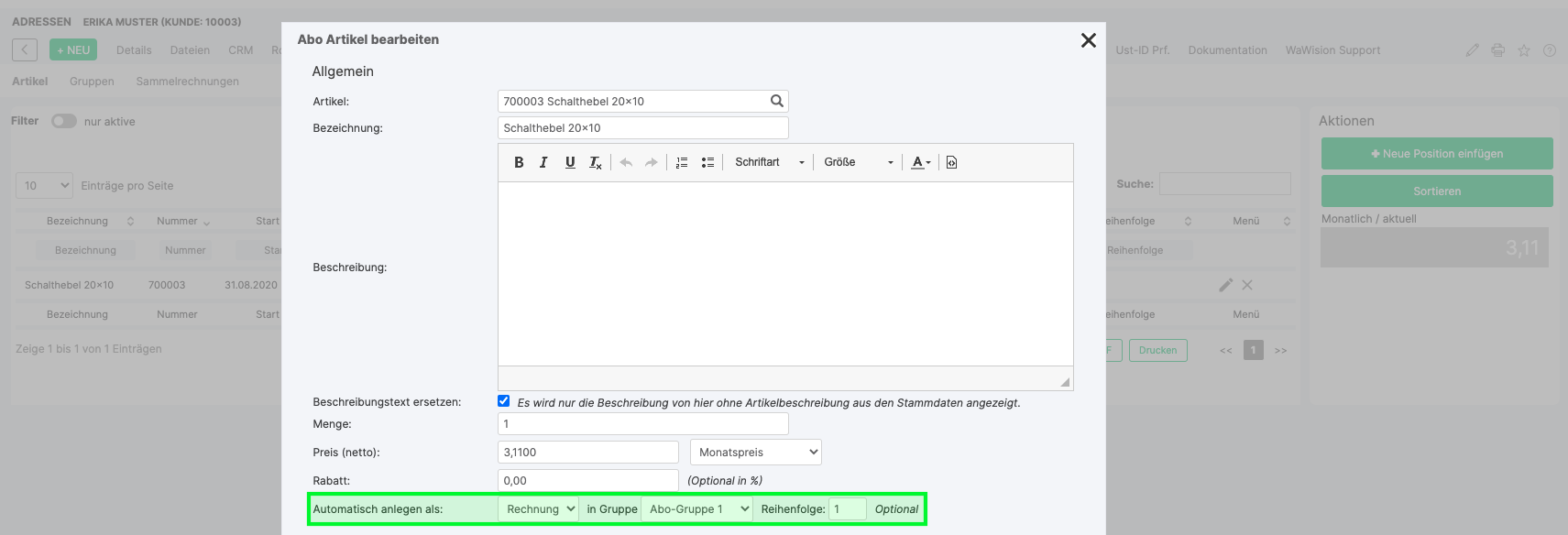 Description → Description of the subscription article in the document be changed if necessary)