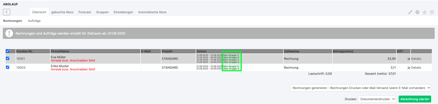 Invoices or orders can be created automatically via the subscription run. The "Overview" shows the customers and articles to be invoiced with the invoicing periods.