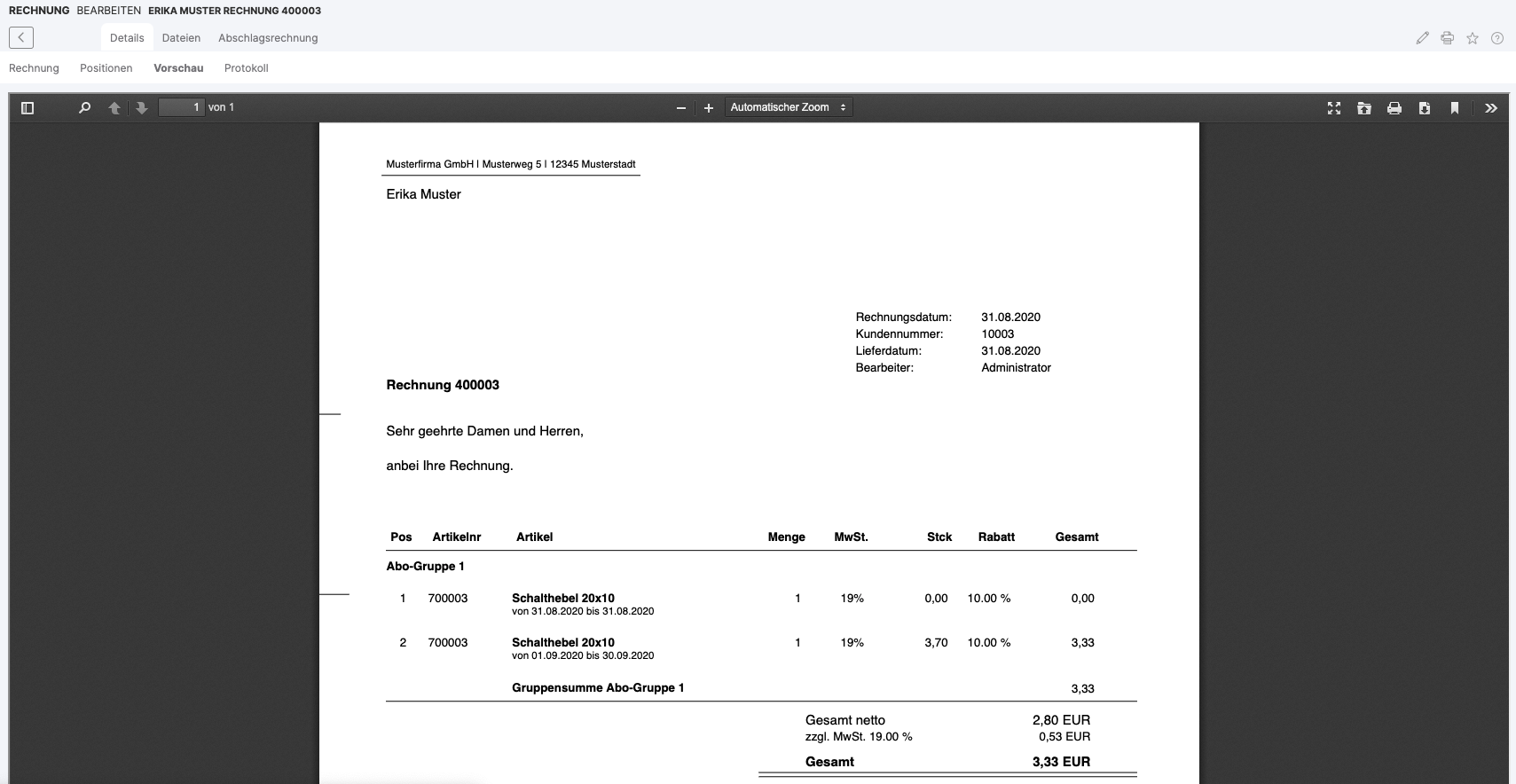With subscription groups, articles in the subscription invoices can be combined into so-called subscription groups. These then appear grouped on the invoice. Individual invoices can also be created for each subscription group.