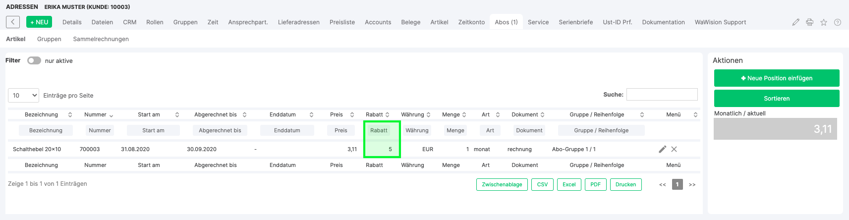 Subscriptions are created directly in the address in the "Subscriptions" tab. Here articles can be inserted, which the customer has booked. In addition to recurring charges, one-off items (e.g. goods) can also be billed.