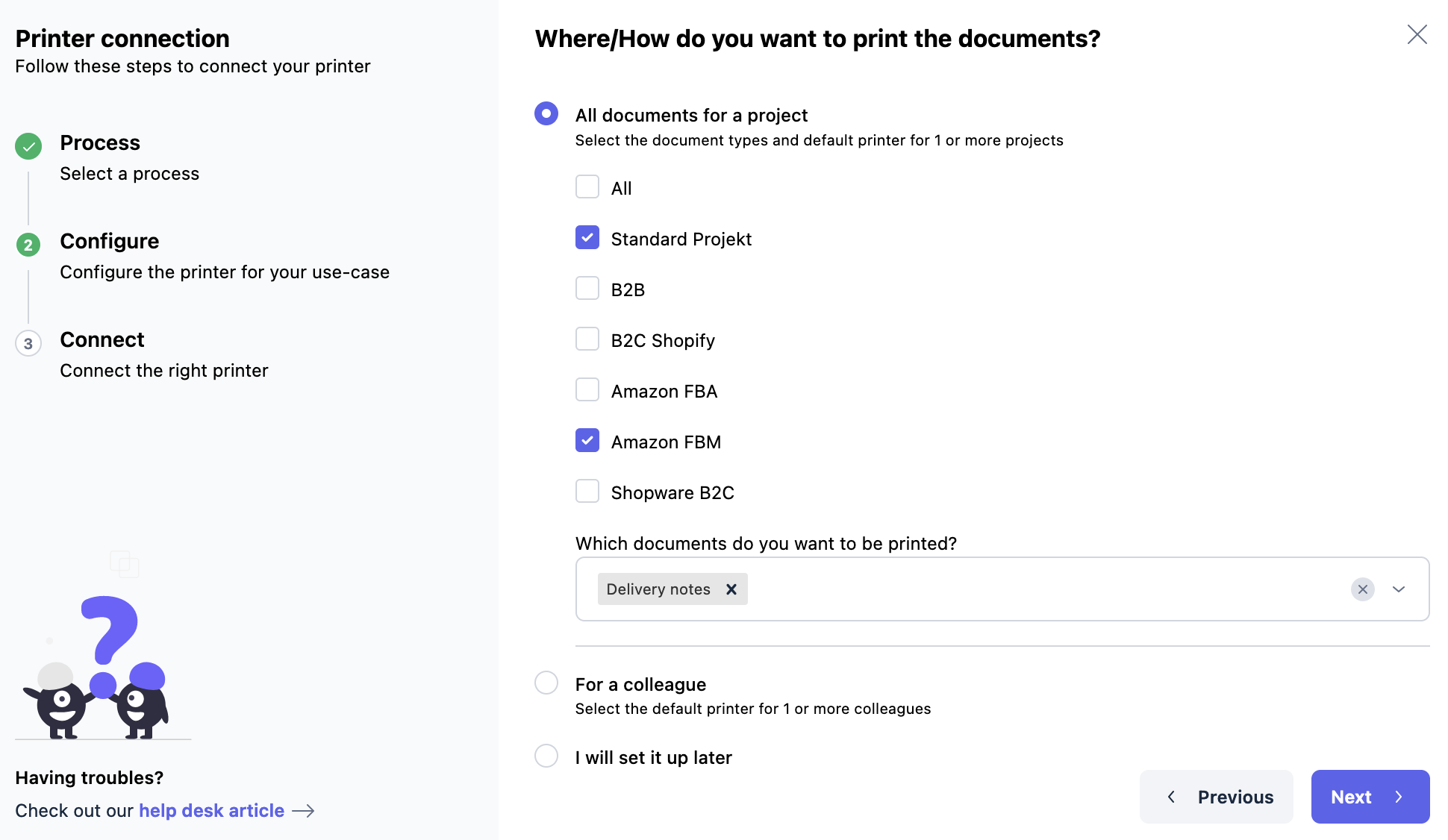 Shipment documents > All documents for a project: Select the projects you want to print documents for. This way you can, for example, differentiate between printers for B2B and B2C. You can also select what kind of documents you want to print for this project. So you can decide to print a specific type of document only at a certain printer where it can be reviewed.