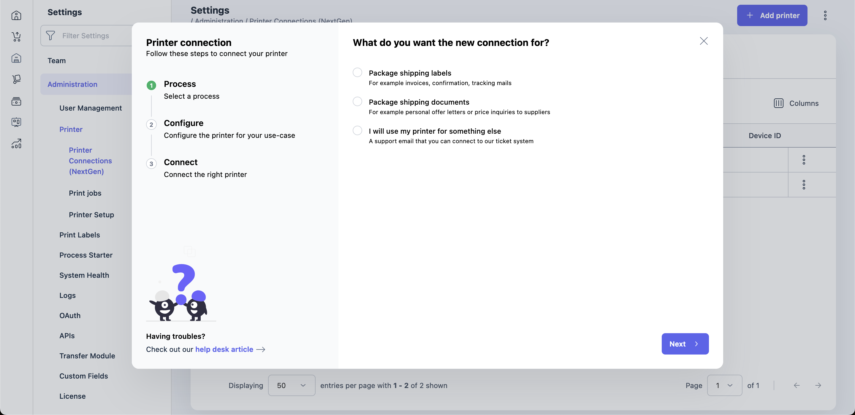 New printers can be connected to your instance via the Printer wizard in the settings.
