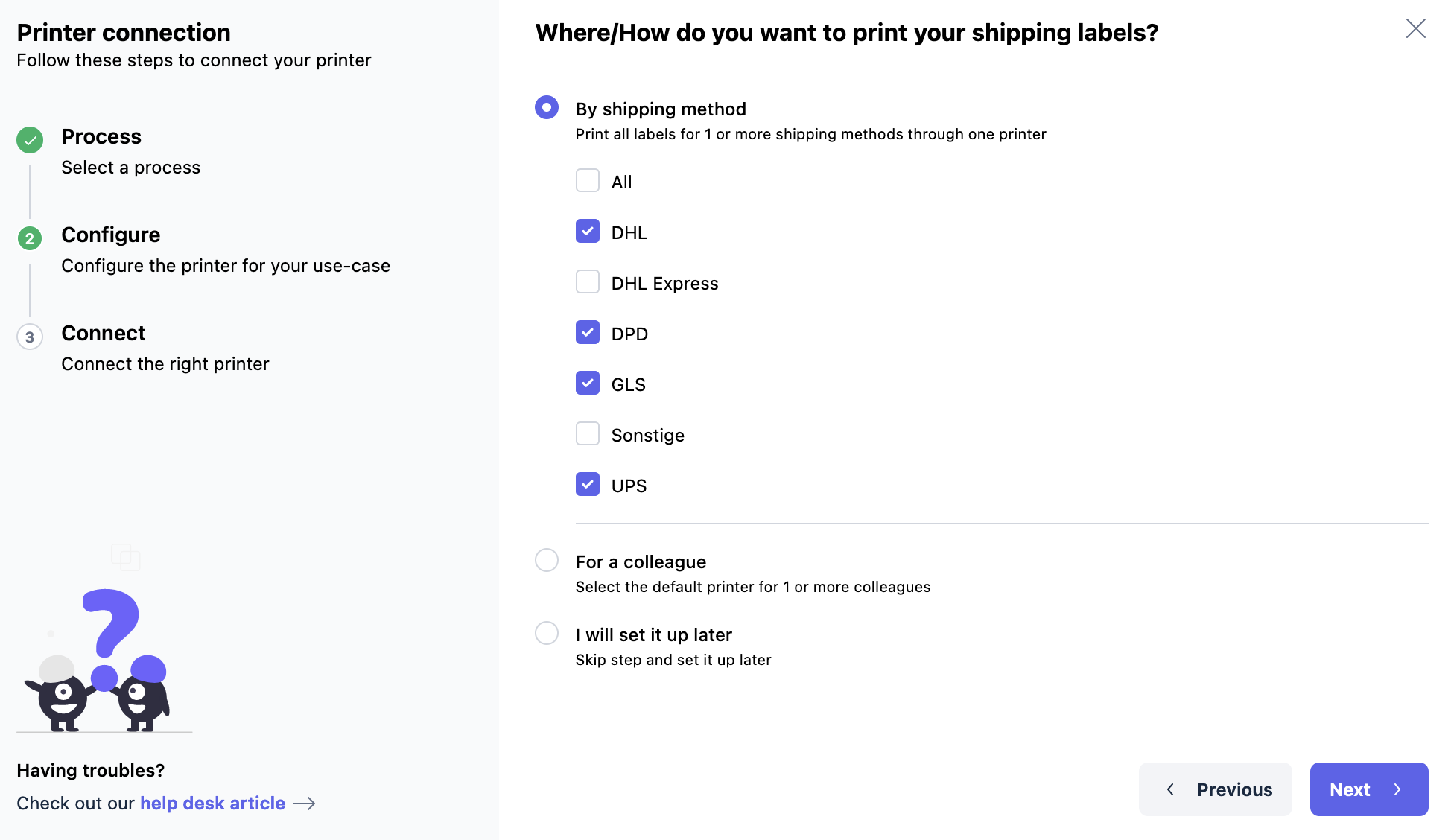 For a colleague: Select which one of your users should be able to use this printer. If one of the selected users wants to print a shipping label or a shipment document, this printer will be used.