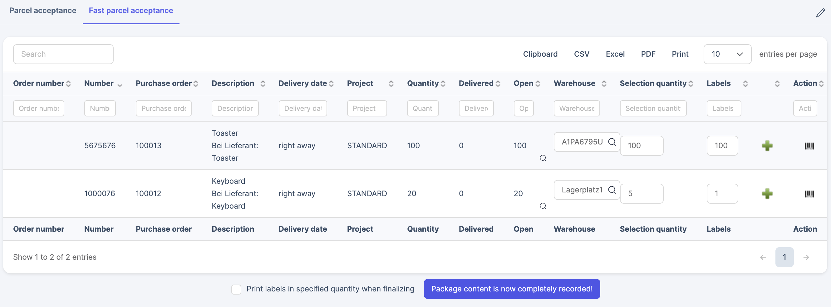 You are forwarded to the Fast parcel acceptance tab, where the undelivered positions of the supplier are displayed. You can sort them according to different parameters such as Order number, Delivery date and Project. The table shows you the total quantity contained in the delivery, the already delivered quantity that has previously been accepted and the resulting open quantity.