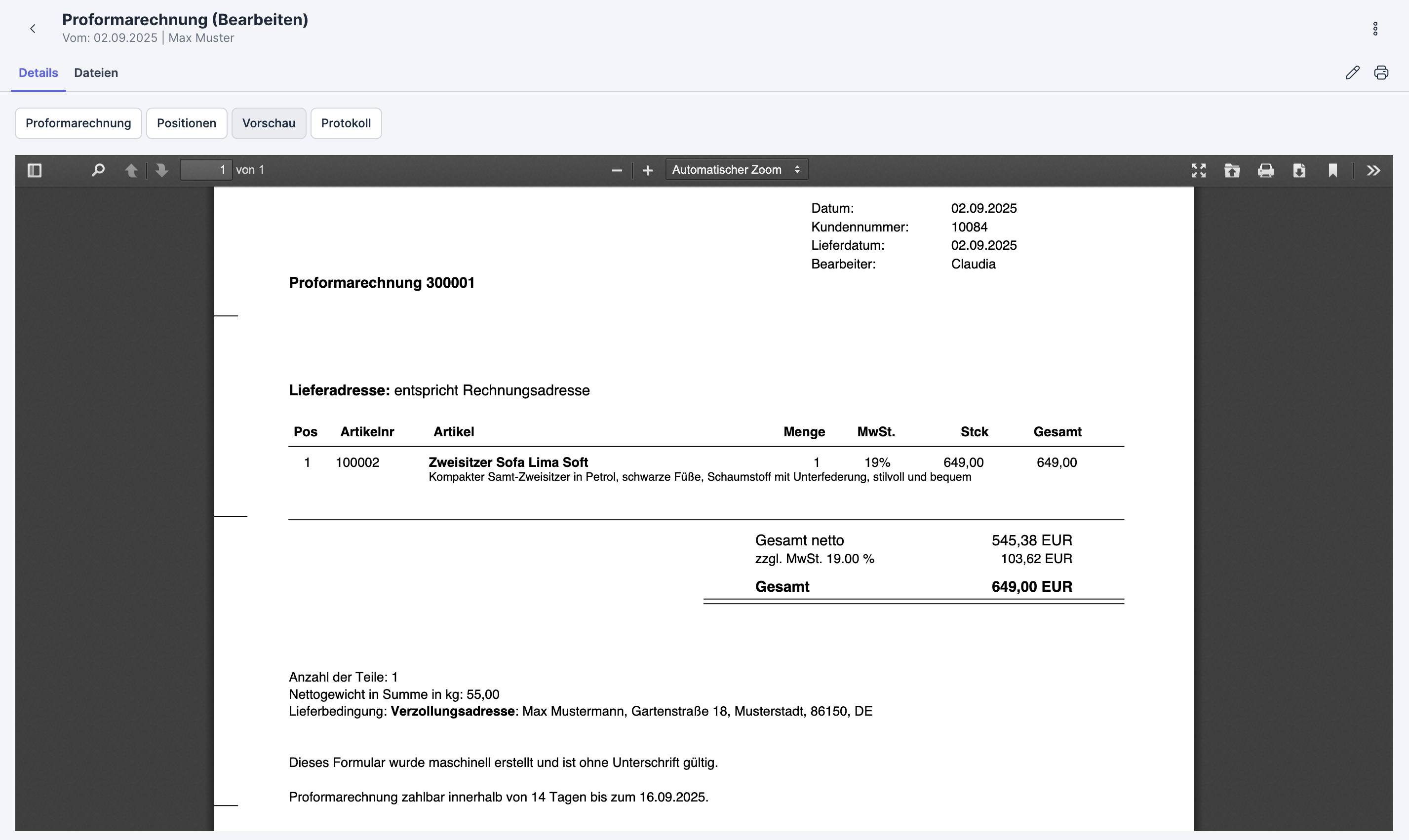 If you need a pro forma invoice that does not arise directly from a sales order or delivery note, you can create it completely independently in the module, select customer and positions and send the receipt after checking it in the preview.