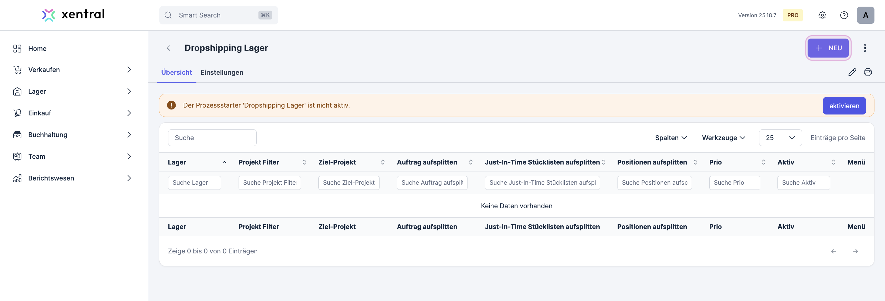 In order to use the full functionality of sales order splitting, at least two warehouses must be configured as dropshipping warehouses, otherwise only project and warehouse would be overwritten for the entire sales order, but no splitting would occur.