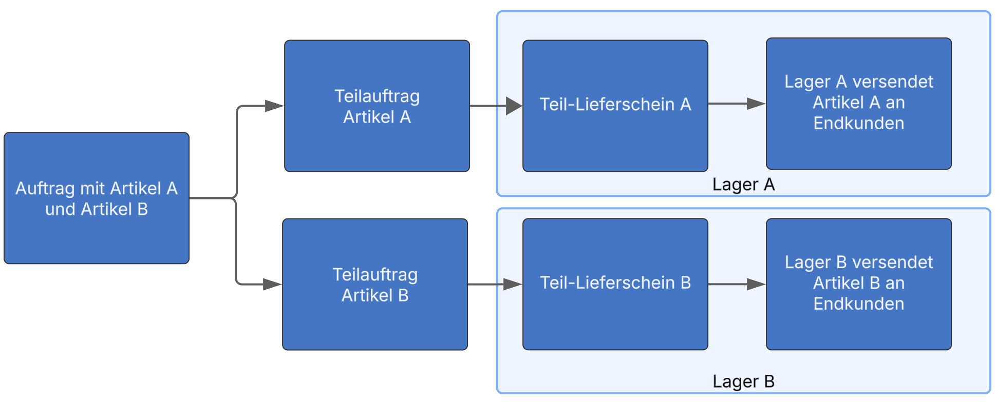 Always split sales order: The products stored in this storage location are always split from the sales order into a partial order, regardless of whether only partial quantities can be fulfilled or not. If there are still remaining quantities / residual positions left after the split, the system continues its check at the warehouse with the next higher priority.