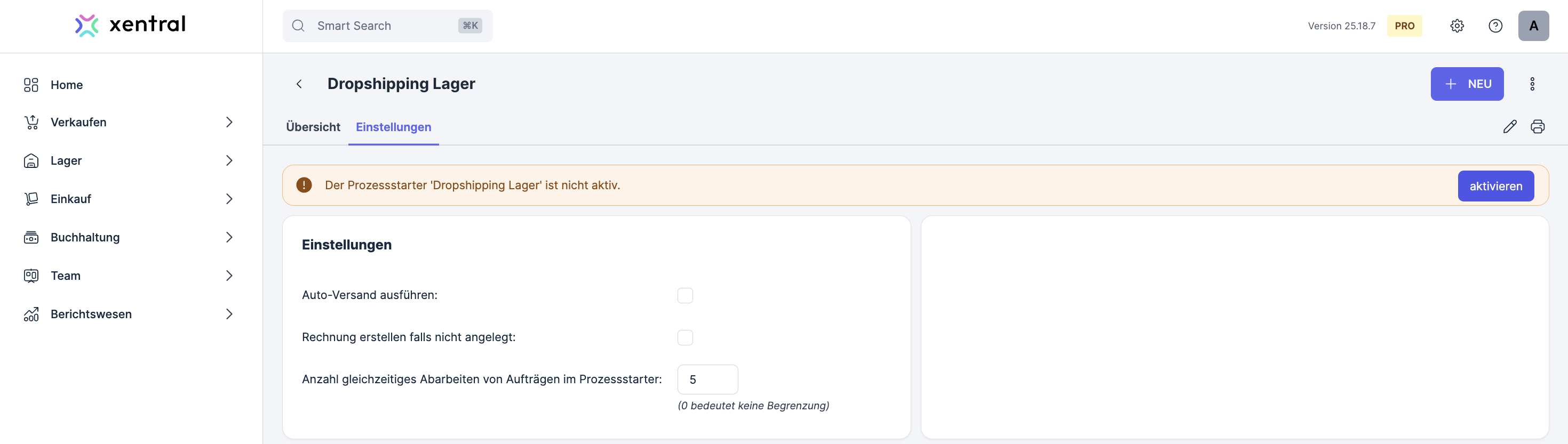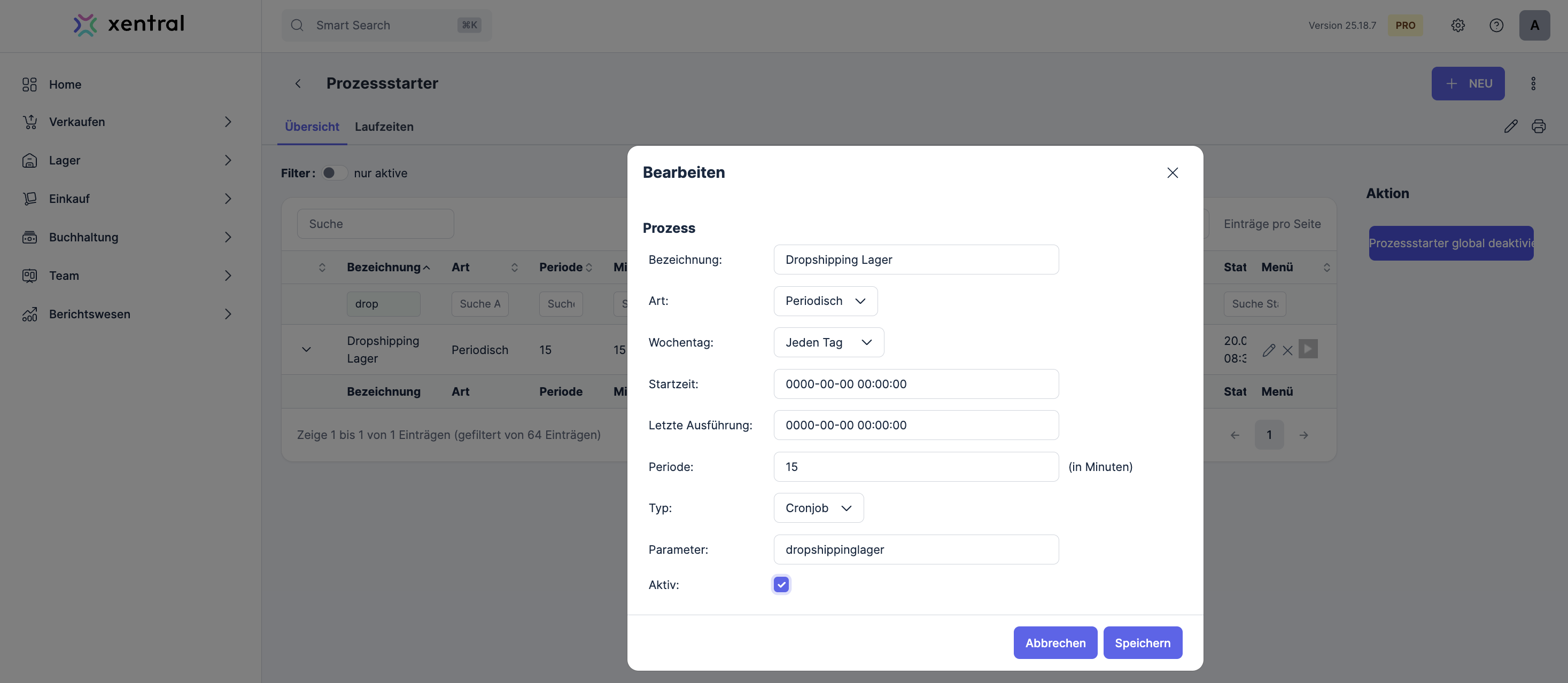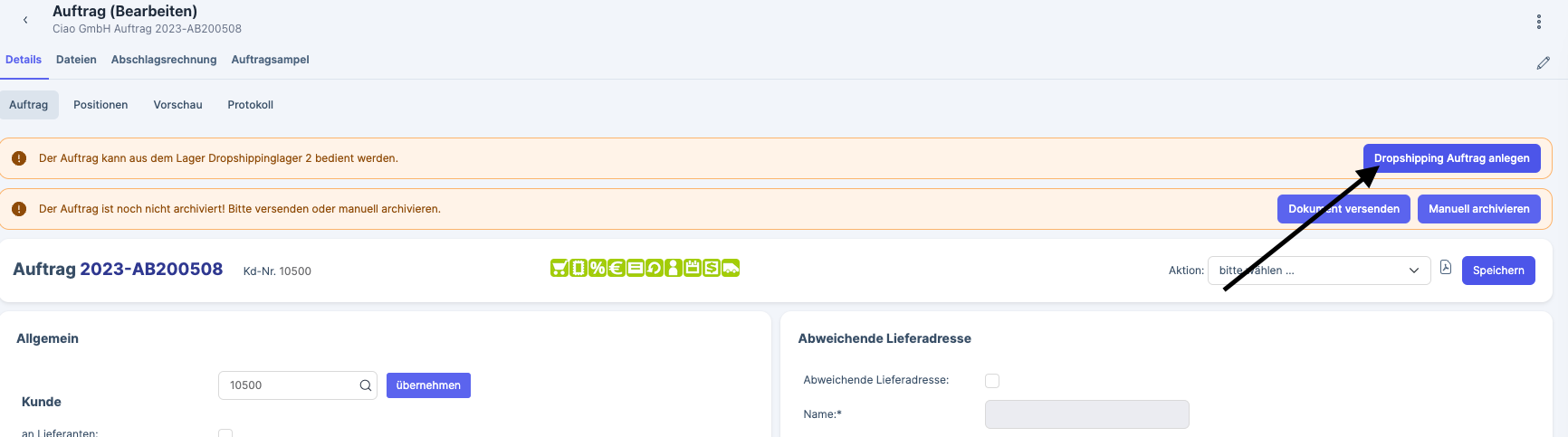 To automatically check all open sales orders for products that are available in a dropshipping warehouse, you can use the process starter. To do this, open the Process starter module and activate the dropshippinglager parameter. Matching sales orders are split into partial orders each time the process starts.