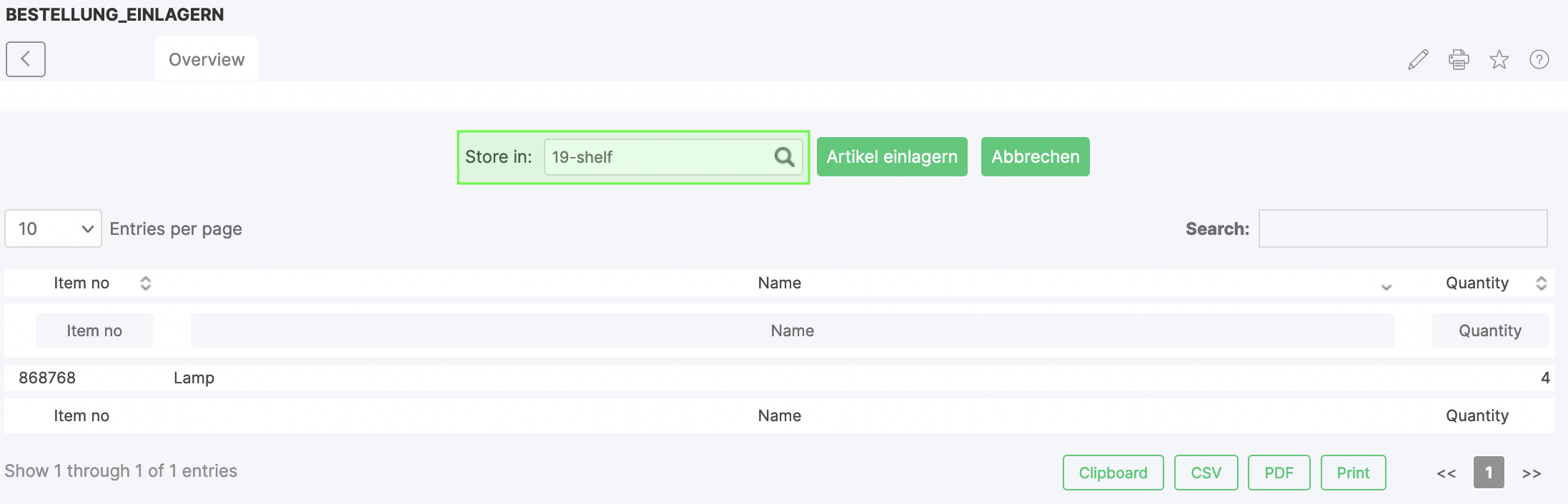 A position overview of the order will then appear and the storage location can be selected in order to store the order completely.
