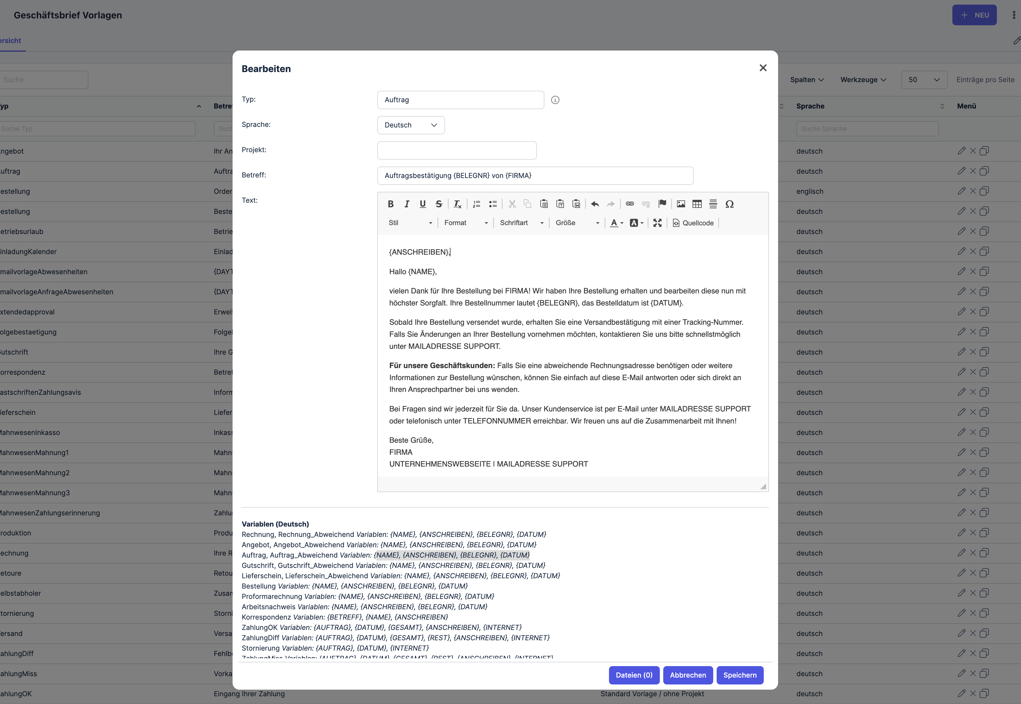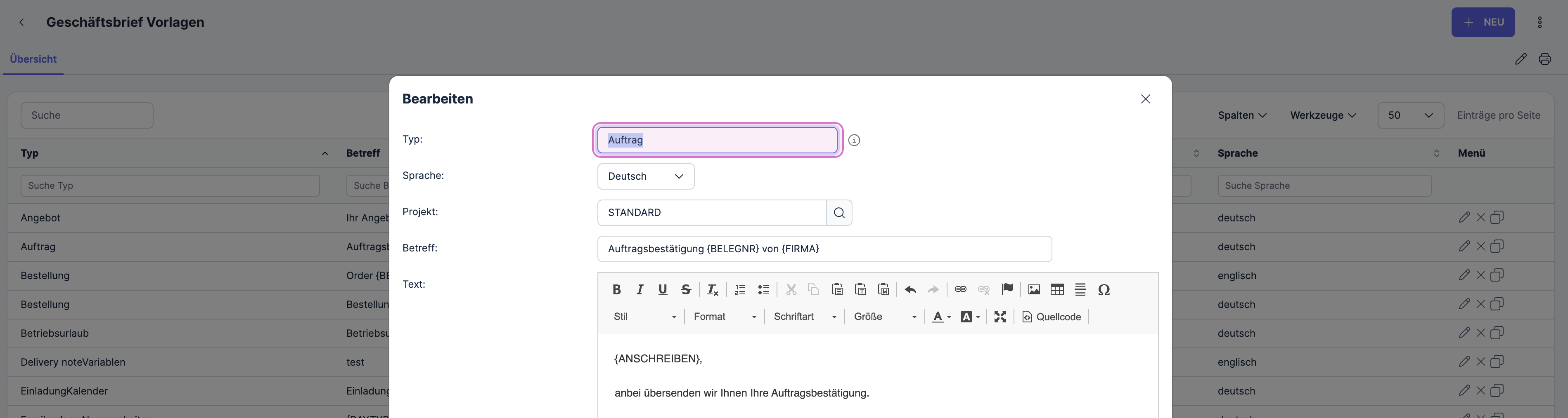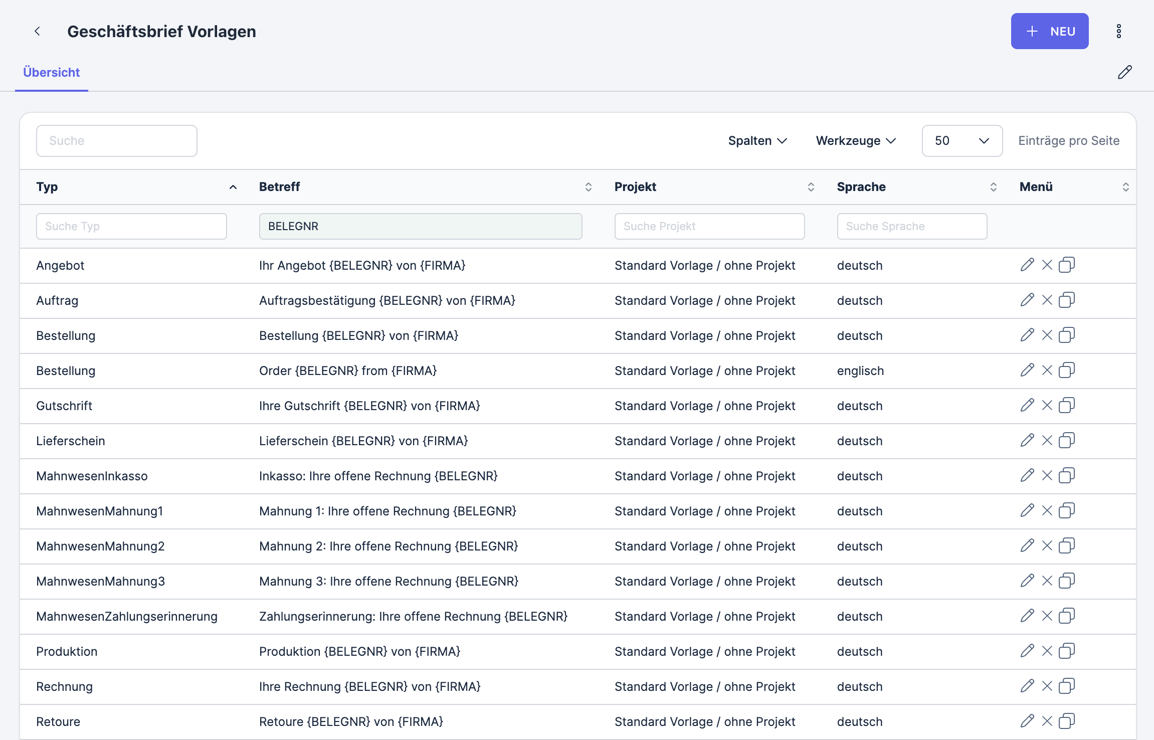The overview displays all created business letter templates. Here, you can create new templates, edit, copy, or delete existing ones.