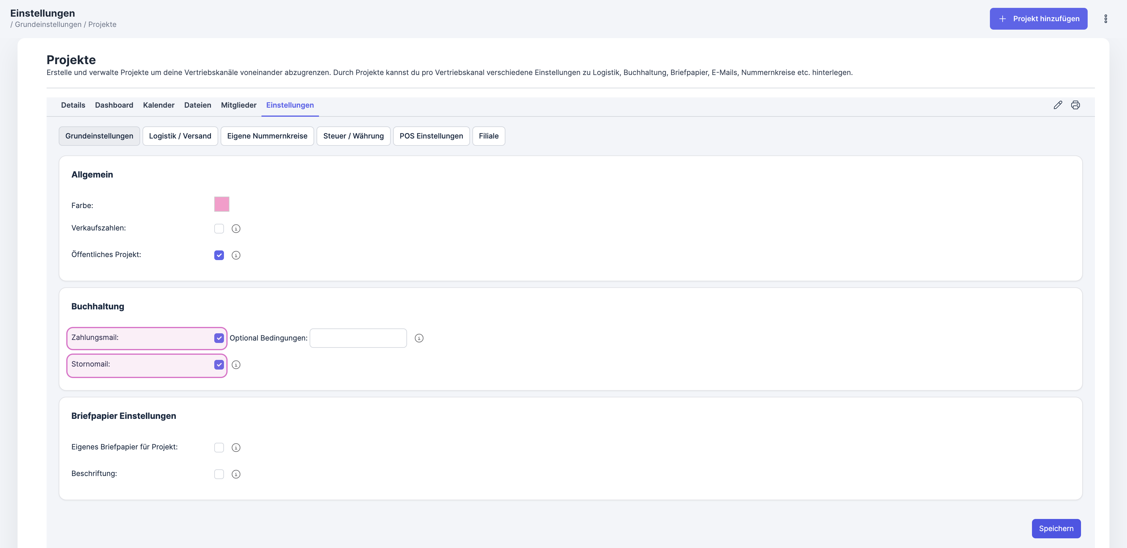 For the automatic dispatch of payment reminders, the zahlungsmail process starter is required. This process starter sends the reminder after the configured number of days. You can adjust these settings under Dunning > Settings. Additionally, the payment reminder option must be enabled in the project settings.